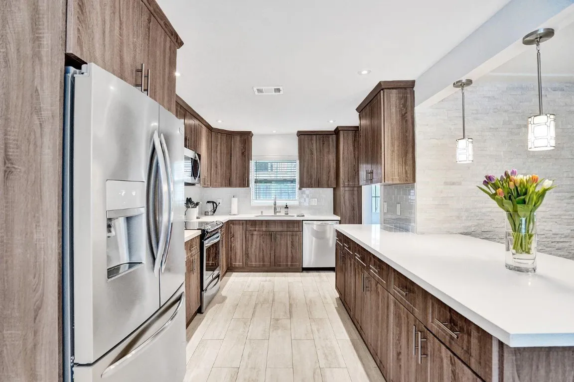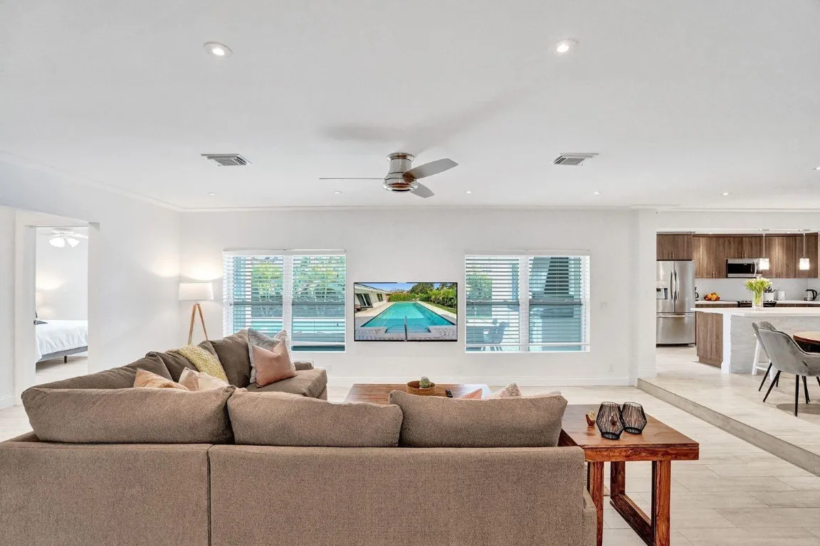 Beautifully updated 4-bedroom, 3-bath pool home in gated Sunrise Intracoastal. Features include light wood-look tile floors, a striking rough cut marble feature wall, recessed LED lighting, impact-resistant doors and windows, and custom closets throughout. The spacious kitchen offers stainless steel appliances and counter seating. The primary suite and guest suite open directly to the backyard and pool. The south-facing backyard enjoys all-day sun, lush tropical landscaping for privacy, and outdoor kitchen, dining, and lounge areas surrounding the large pool. A circular driveway leads to a porte-cochere. Prime location: less than a mile to the beach, near parks, The Galleria, and Las Olas Boulevard