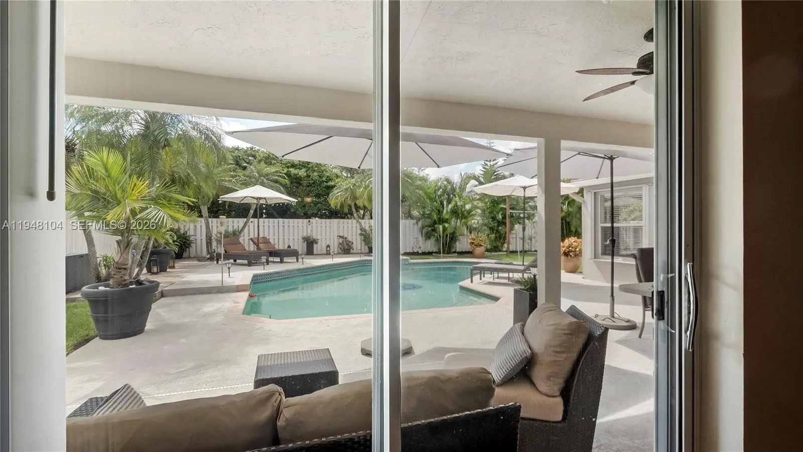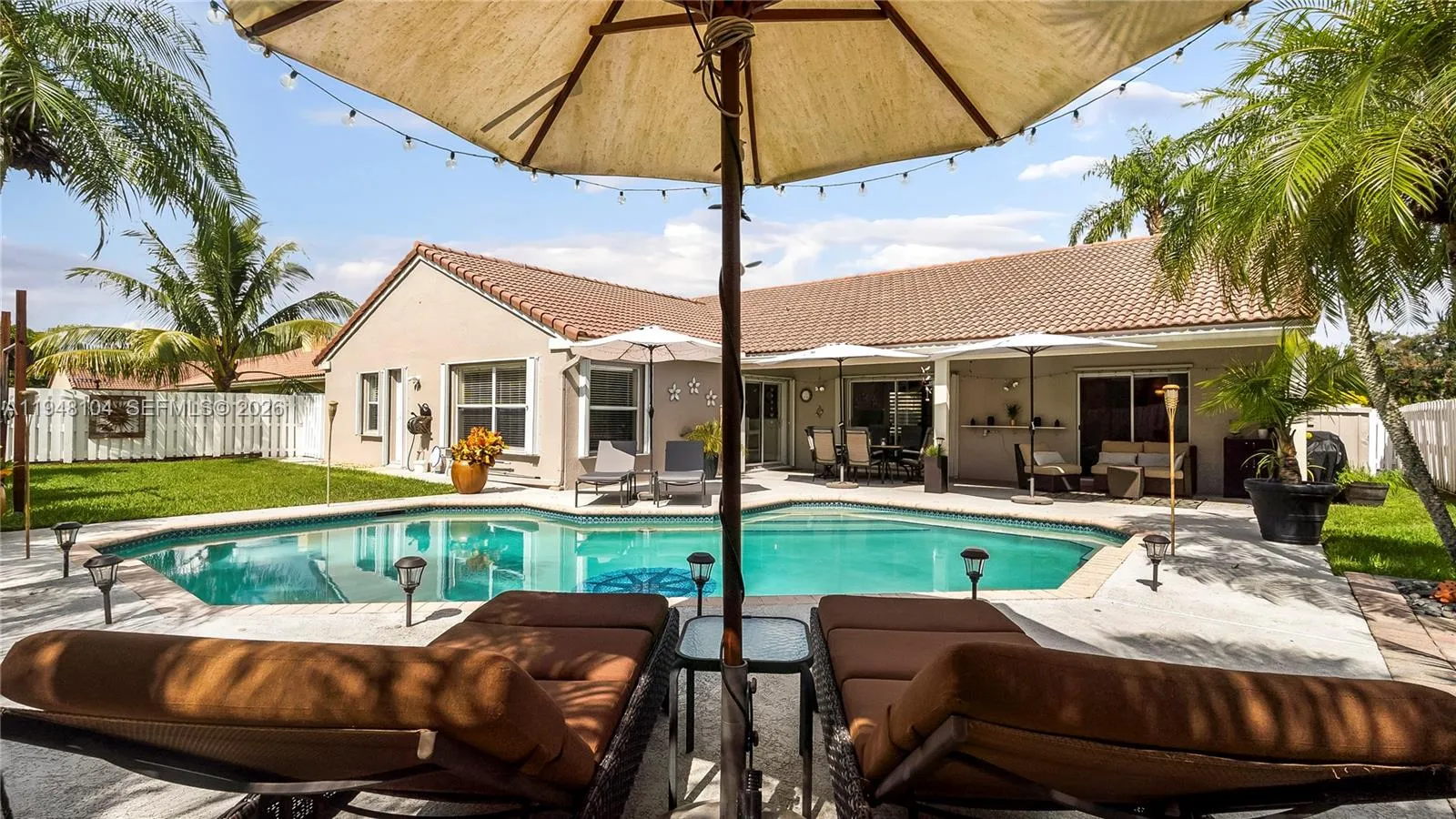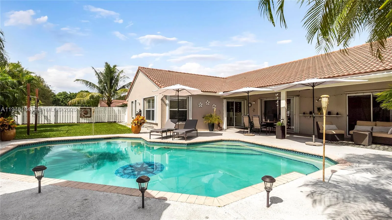 LOVINGLY MAINTAINED 4-bedroom, 2.5-bath home that has been lived in with pride and care. This warm and welcoming residence is where memories were made and children were raised. Located in THE ESTATES at the RESIDENCES OF SAWGRASS. A neighborhood of estate-style, private homes. rnENTERTAIN IN STYLE in the oversized POOL AREA, designed for fun, relaxation, and unforgettable gatherings. Enjoy a HUGE COVERED PATIO AREA perfect for lounging, dining, or hosting year-round, plus extra grassy space ideal for play, pets, or outdoor games. This backyard offers the perfect blend of comfort, space, and resort-style living.rnThe living areas feature elegant 24×24 tile flooring, while the bedrooms offer wood parquet floors and walk-in closets with custom built-ins. ZEBRA BLINDS, NO POPCORN ceilings throughout. Exterior painted in 2023. Equipped with a portable generator connection, NEW POOL PUMP, NEW HEATER and A NEW SPRINKLER TIMER. Multiple sheds and covered storage areas in backyard, Garage is AIR CONDITIONED. The complete accordion shutters provide excellent hurricane protection.rnRoof 2005, AC 2016, WH 2021.rnSpacious laundry room with washer and dryer with built-in drawers. Located in a great neighborhood with convenient access to major highways, Sawgrass Mills Mall, restaurants, and schools. Furniture can convey with exceptions.rnLow HOA fee, Big backyard vibes, Endless Entertaining— PLUS seller open to concessions. Don’t miss this one!