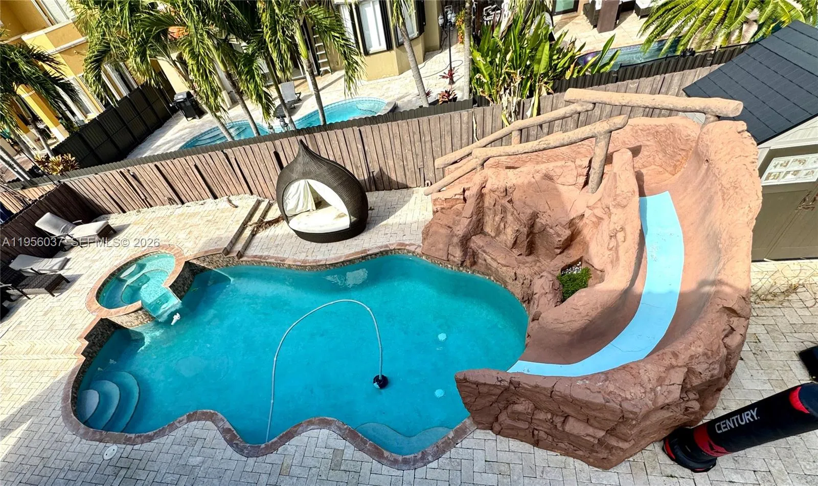 NO HOA! Single-family home offering 3,137 SF of living area with a 5-bedroom, 4-bathroom layout. Private parking space suitable for boat, RV, truck, or multiple vehicles. Property features include ceramic tile flooring throughout, a marble entry foyer, high ceilings, and marble stairs with aluminum handrails. Spacious kitchen with island and stainless-steel appliances. Laundry room with sink.rnrnThe first floor includes 1 bedroom and 1 full bathroom. The second level features 4 bedrooms and 3 bathrooms, including an impressive primary bedroom with two separate private toilet areas, large bathtub, shower, and double-sink vanity; 1 bedroom with a private bathroom, and 2 bedrooms sharing a Jack & Jill bathroom.rnrnThe backyard offers a private resort-style pool with jacuzzi, waterfall, waterslide, and marble pavers, ideal for outdoor enjoyment and entertaining. Additional features include a remodeled 2-car garage with modern epoxy flooring and updated lighting, as well as accordion hurricane shutters on all windows and glass doors. Property is conveniently located near shopping centers and major roadways. Easy to show! Schedule your private tour today.