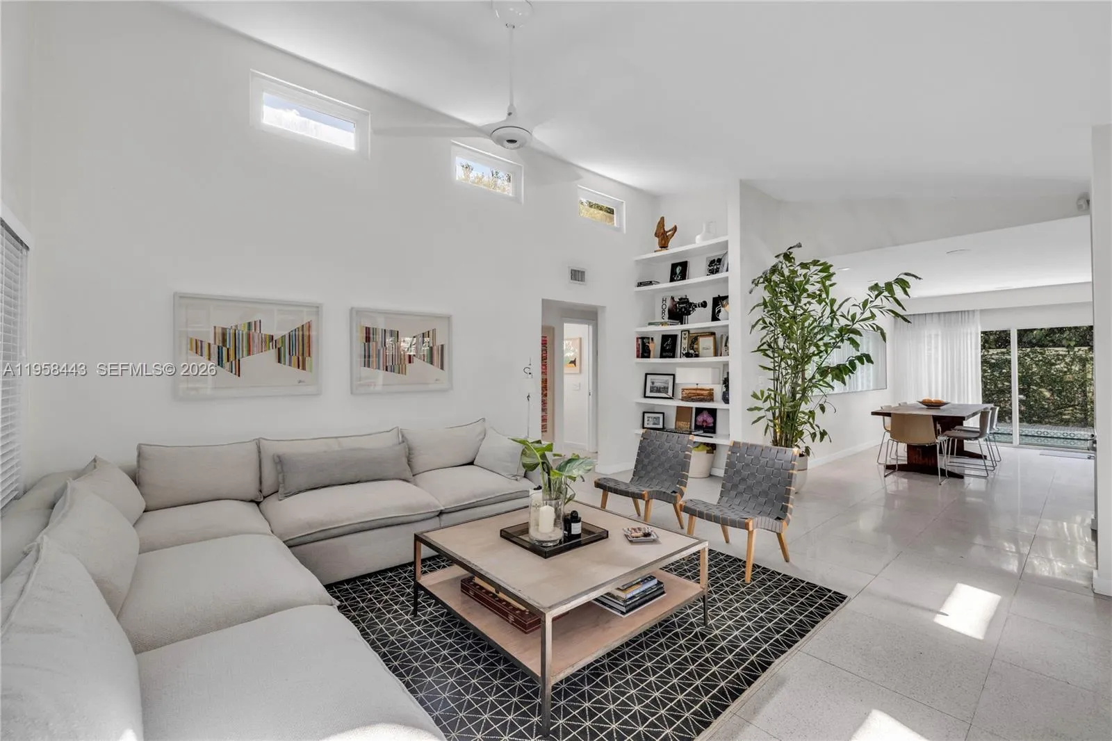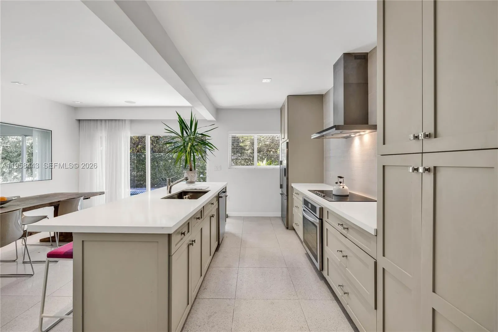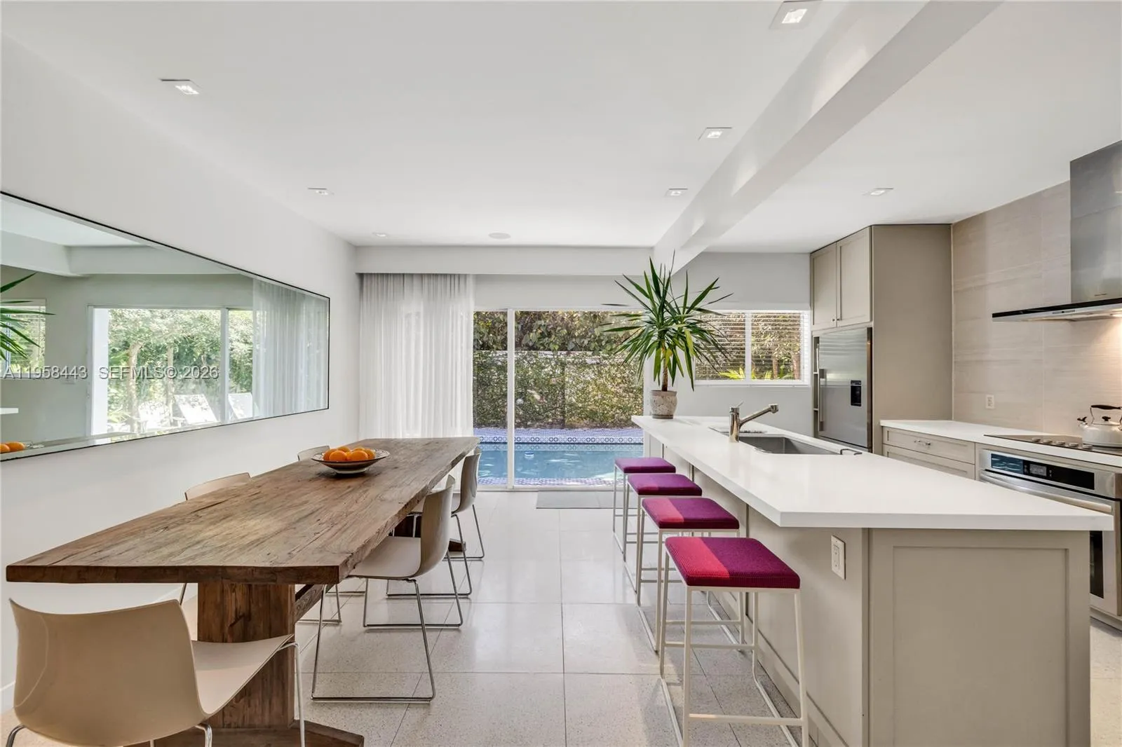 POOL home RETREAT! Experience living in TRUE MIAMI Mid-Century MODERN “Palm-Springs-style” Bungalow…nestled in Sherwood Forest…a slice of romance & history with peacocks and natural lush landscaping! Architectural classic features terrazzo floors, abounding in natural light w/oversized impact windows & vaulted high ceilings with tall clerestory windows…Amazing “GREAT VIBE” the minute you walk in! The entire house has been remodeled from top to bottom! Gorgeous large new kitchen overlooks the swimming pool and spacious entertaining + dining room. Both bedrooms are roomy, and the Primary bedroom offers a new bathroom ensuite w/walk-in closet. * Extra lounge space currently used as TV nook w/option for home office! A full 1-car garage w/finished ceiling and a laundry+closet area.