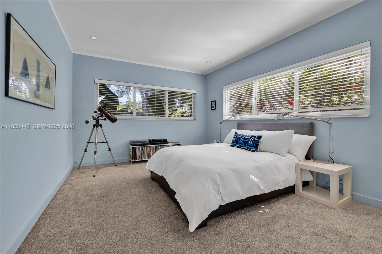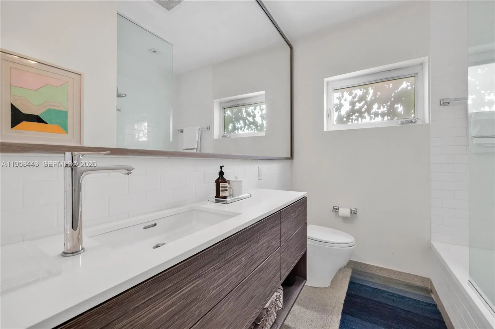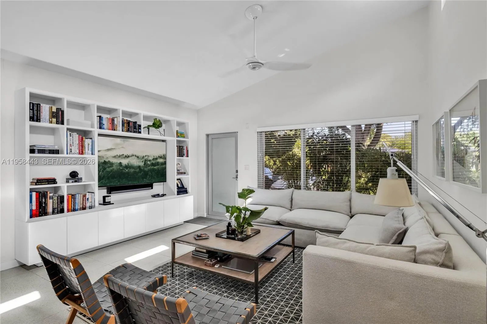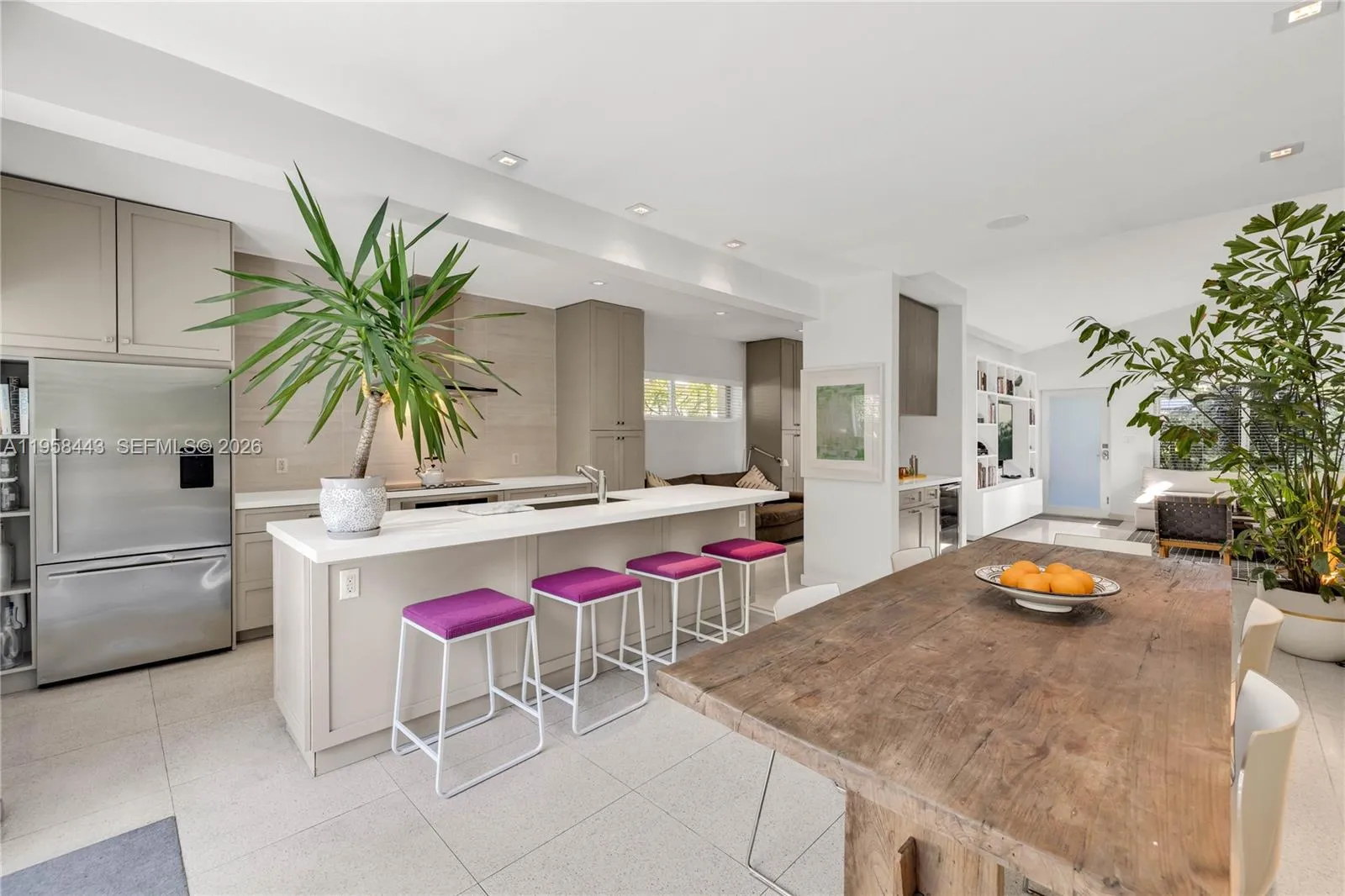 POOL home RETREAT! Experience living in TRUE MIAMI Mid-Century MODERN “Palm-Springs-style” Bungalow…nestled in Sherwood Forest…a slice of romance & history with peacocks and natural lush landscaping! Architectural classic features terrazzo floors, abounding in natural light w/oversized impact windows & vaulted high ceilings with tall clerestory windows…Amazing “GREAT VIBE” the minute you walk in! The entire house has been remodeled from top to bottom! Gorgeous large new kitchen overlooks the swimming pool and spacious entertaining + dining room. Both bedrooms are roomy, and the Primary bedroom offers a new bathroom ensuite w/walk-in closet. * Extra lounge space currently used as TV nook w/option for home office! A full 1-car garage w/finished ceiling and a laundry+closet area.