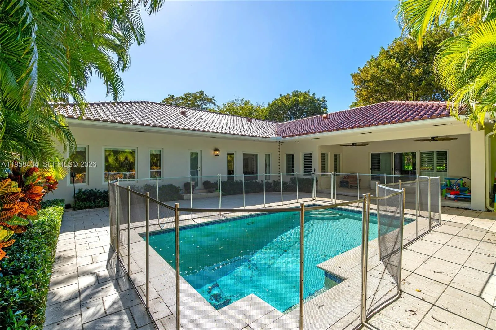 Situated on a prime corner lot along one of Coral Gables’ tree-lined avenues, this elegant, privately gated residence offers a refined blend of classic charm and modern upgrades. The home features high-impact windows and doors, a bright south-facing orientation, and a functional layout ideal for both everyday living and entertaining. The kitchen is equipped with Thermador appliances and custom cabinetry. Interior highlights include built-in cabinetry, washer and dryer, automatic garage door opener, and owned alarm equipment. Recent improvements include a new air conditioning system, upgraded roof insulation, whole-house water softener and filtration system, security cameras with upgraded wiring, and a 10-channel home theater system with indoor and outdoor speakers. Outdoor features include a fenced and gated yard, patio, swimming pool, exterior lighting, and a perimeter gate providing enhanced privacy. Additional systems include a mosquito control system and an installed alarm system (monitoring subscription required by buyer). Conveniently located near Miracle Mile, dining, shopping, and major roadways. Shown by appointment only.