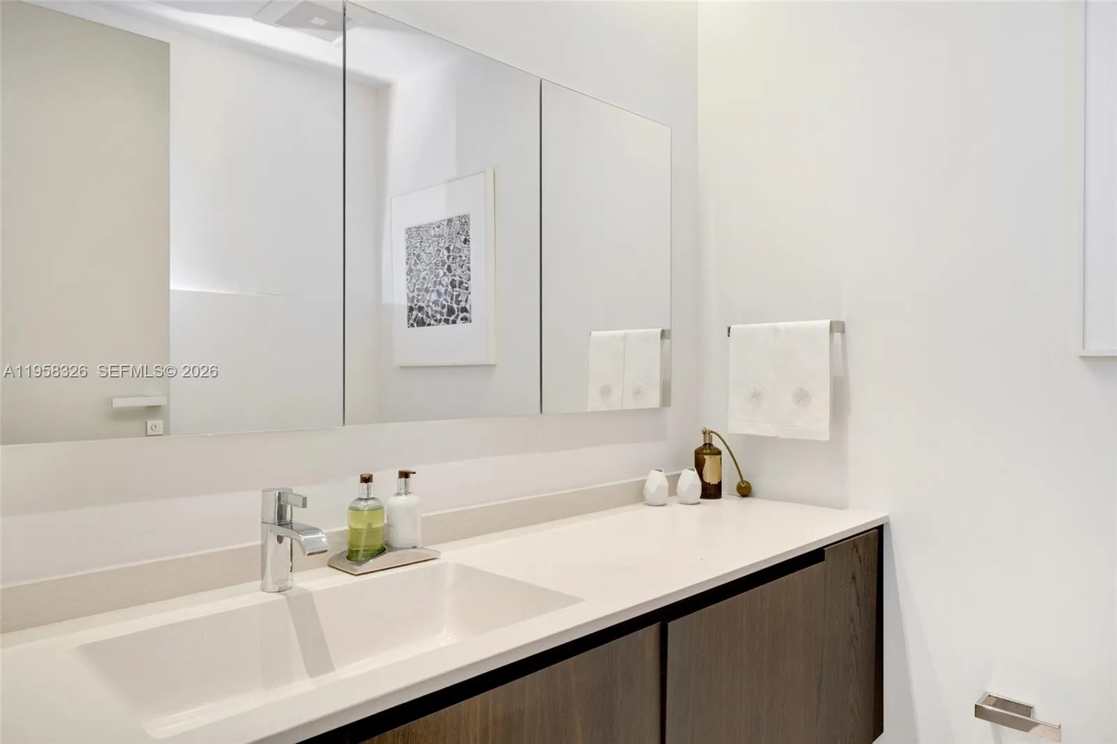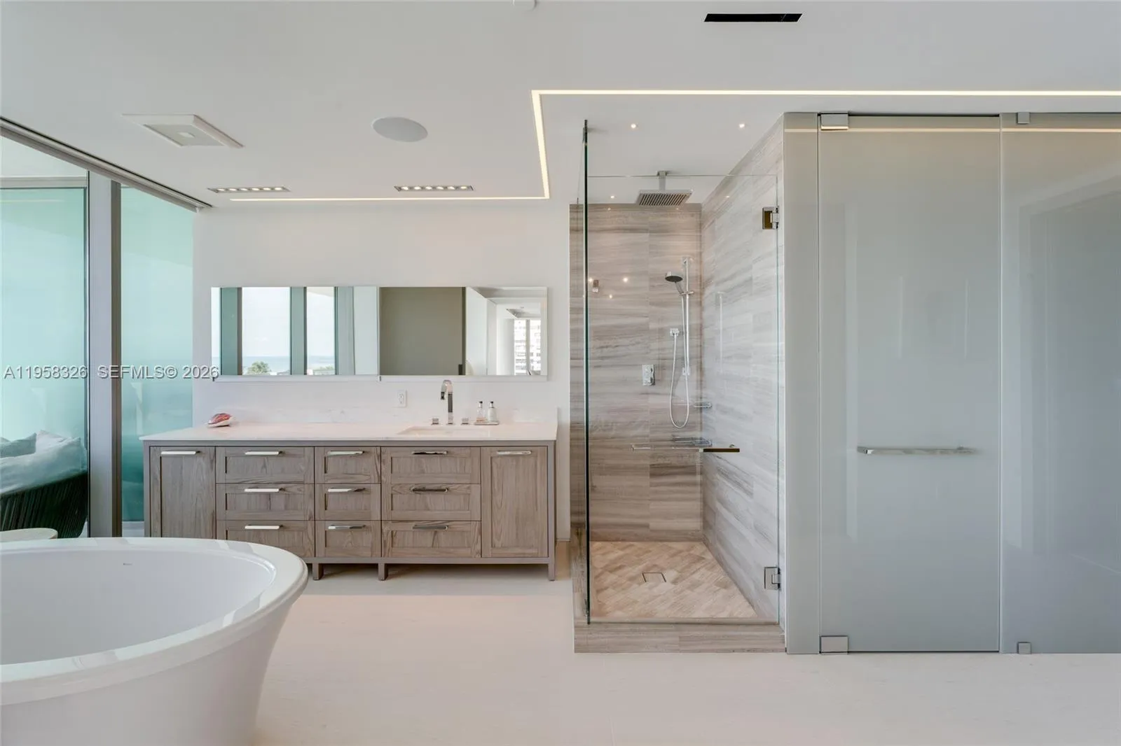 Extensively renovated and move-in ready 4-bedroom, 5.5-bath corner beachfront residence at Oceana Key Biscayne, offering refined architecture, thoughtful detailing, and seamless indoor-outdoor living. Floor-to-ceiling glass fills the home with natural light and frames ocean, bay, and village views enjoyed from every room and the wrap-around terraces. Architectural elements include shadow reveal wall details, layered architectural lighting and Res Italia custom doors. Custom millwork is carried throughout, with Giellesse Italian closet systems and shelving as well as Casabath Italian bathroom cabinetry.rnrnThe primary suite offers sweeping ocean views, a spa-like bath with soaking tub overlooking the ocean, and two full primary bathrooms with walk-in showers. Three additional bedrooms enjoy beautiful and completely private views overlooking Biscayne Bay and the Village of Key Biscayne.rnrnThe kitchen features Binova Italian cabinetry, Miele appliances, an oversized waterfall island, and a separate walk-in pantry with wine storage. The home is equipped with Savant and Lutron smart home systems with automated lighting, climate control, audio/video and blinds on every door and window. Unit has 4 parking spaces and 2 storage units.rnrnOceana Key Biscayne provides world-class amenities including 24-hour concierge, beachfront fitness center and spa, 500ft of beach, oceanfront restaurant, tennis court, putting green, media room/cinema, valet, golf cart parking, and more.