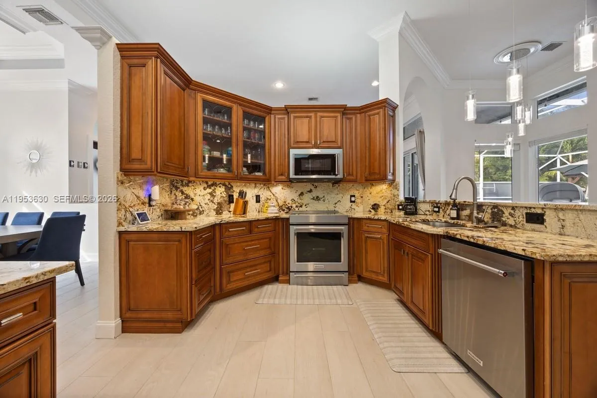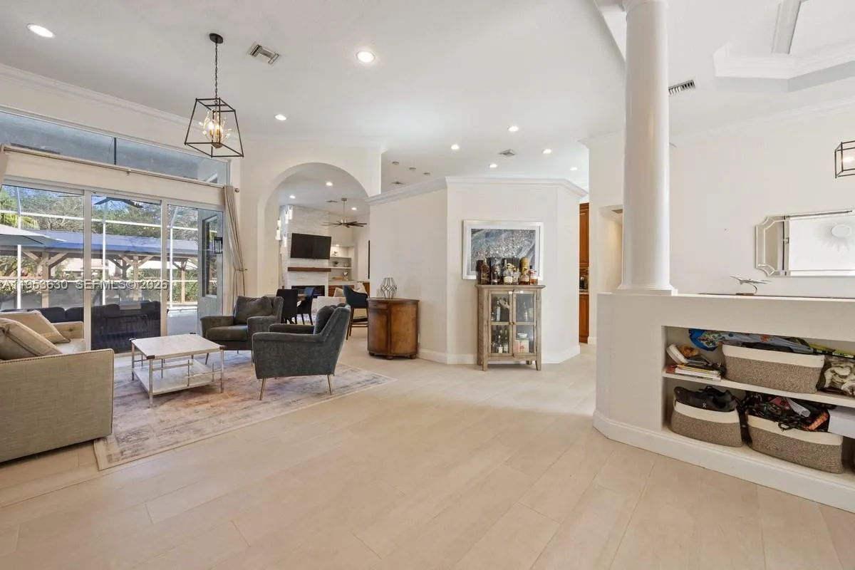 Step into this stunning home and make it your personal sanctuary! Set within the prestigious Isles community with a 24-hour manned gate, this extensively upgraded residence features a sought-after 3-way split floorplan offering privacy and flexibility for families and guests.rnThe home showcases major improvements, including full impact windows and doors (2025), impact garage doors, and a 2019 roof for peace of mind. Enjoy the saltwater pool with a 2023 Rheem pool heater, child safety fence, and fenced yard, plus a backyard concrete slab with electrical and piping already in place for future enhancements. Additional highlights include security cameras, exterior lighting, alarm system, and a 2025 Rheem 80-gallon heat pump water heater. The finished garage features a custom adjustable slat wall system designed for efficient storage and organization.rnThe upgraded kitchen features KitchenAid appliances (2025), a wine fridge, and a built-in breakfast nook for effortless everyday living. The expansive primary suite offers a large walk-in closet leading to a luxurious spa-style bath with a fireplace, soaking tub, and double vanities. Secondary bedrooms feature new flooring and crown molding. High ceilings, custom decorative wall molding, barn doors, designer lighting, and built-ins in the family room create a refined, high-end feel throughout.rnA move-in ready home that checks every box — schedule your private showing today.