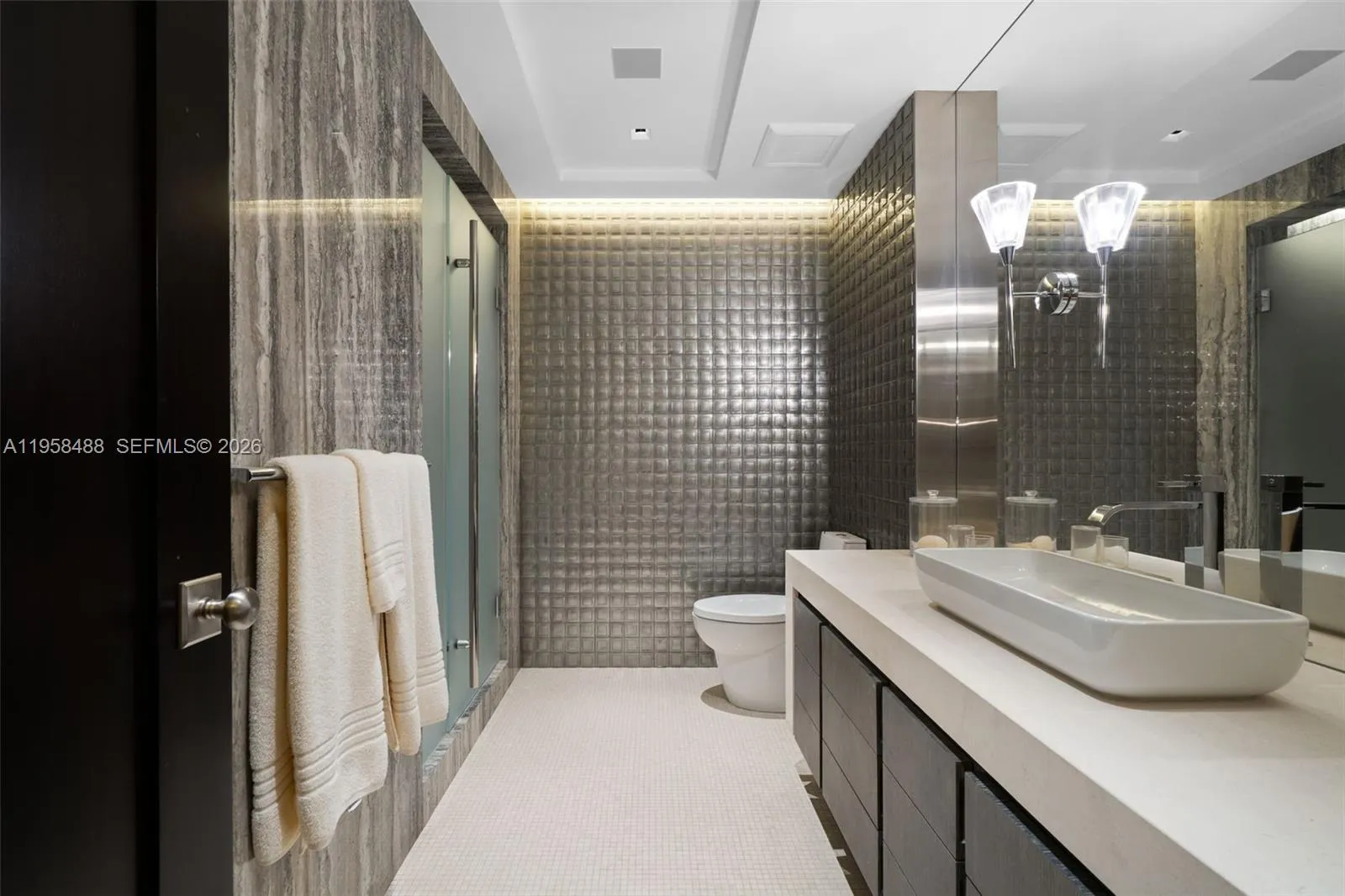 Accessed via private elevator, this exquisite three-bedroom, three-and-a-half-bath east–west flow-through residence offers serene ocean, pool and lush treetop canopy views —ideal for those who appreciate living immersed in a tropical setting. Thoughtfully remodeled, the home features three ensuite bedrooms, a powder room, stunning white oak flooring, and rich dark wood millwork throughout.rnThe residence is equipped with automated lighting, sound, and motorized blinds, and showcases top-of-the-line Miele appliances.rnThe primary suite is a true retreat, featuring a spacious bedroom and a grand marble bath designed with distinct his-and-hers spaces unified by a shared shower, along with two walk-in closets. rnOffered unfurnished and AS-IS. Photo gallery reflects the residence before and after furniture removal.rnThe beachfront building is ideally located steps from the world-renowned Bal Harbour Shops and Harding District, and within walking distance to houses of worship. Amenities include spa services, private restaurant, valet, 24-hour security, pool and beach service, tennis courts, and more.rnBuilding envelope renovations are underway. Unit balconies are currently closed for waterproofing.