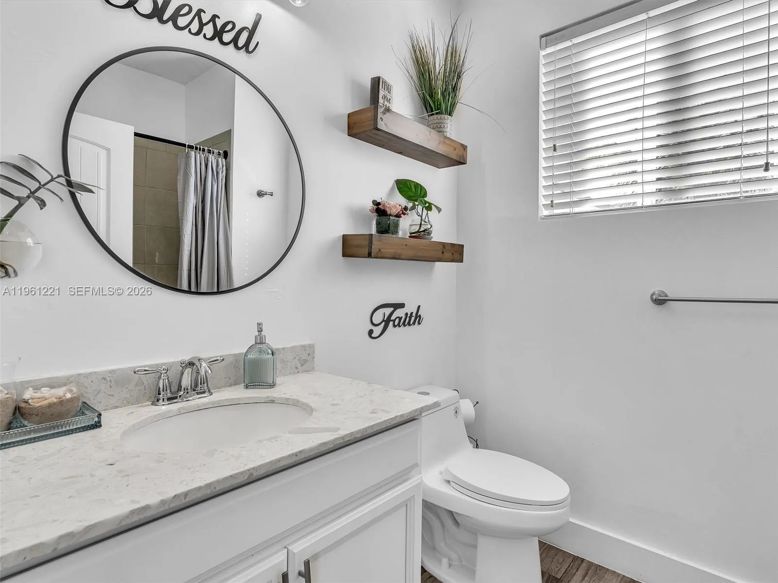 Welcome to this exceptional corner-lot residence offering 5 bedrooms and 3 full bathrooms, including a full bedroom and bath on the main level—ideal for guests or extended family. Bright and airy, the home features quartz countertops, all-wood cabinetry, a large pantry, wood-look porcelain flooring throughout, and plantation shutters. Custom closets elevate the main bedroom spaces. Step outside to your private oasis featuring a sparkling pool, travertine pavers, playground, and included shed. The expansive circular concrete driveway allows parking for multiple vehicles. Enough space to fit a RV and boat. Accordion shutters, security cameras, and full exterior lighting add peace and comfort. No HOA