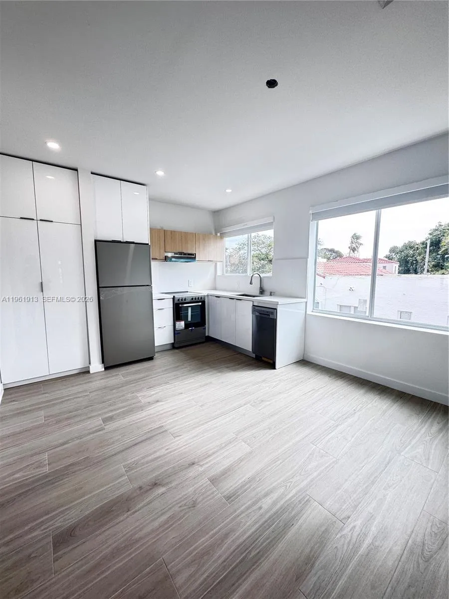 2 bedrooms-2 bathrooms apartment features a clean and contemporary design. Natural light flows throughout. It is located in one of the most desirable neighborhoods of Miami Beach. it’s located upper floor of this 2 stories building. Modern kitchen with white cabinetry, white countertop and stainless steel appliances, including refrigerator, oven and dishwasher, washer and dryer. Contemporary bathrooms with glass-enclosed shower and sleek black vanity. Bedrooms with walk-in closet and ample storage with floor to ceiling cabinets. Lots of natural light.