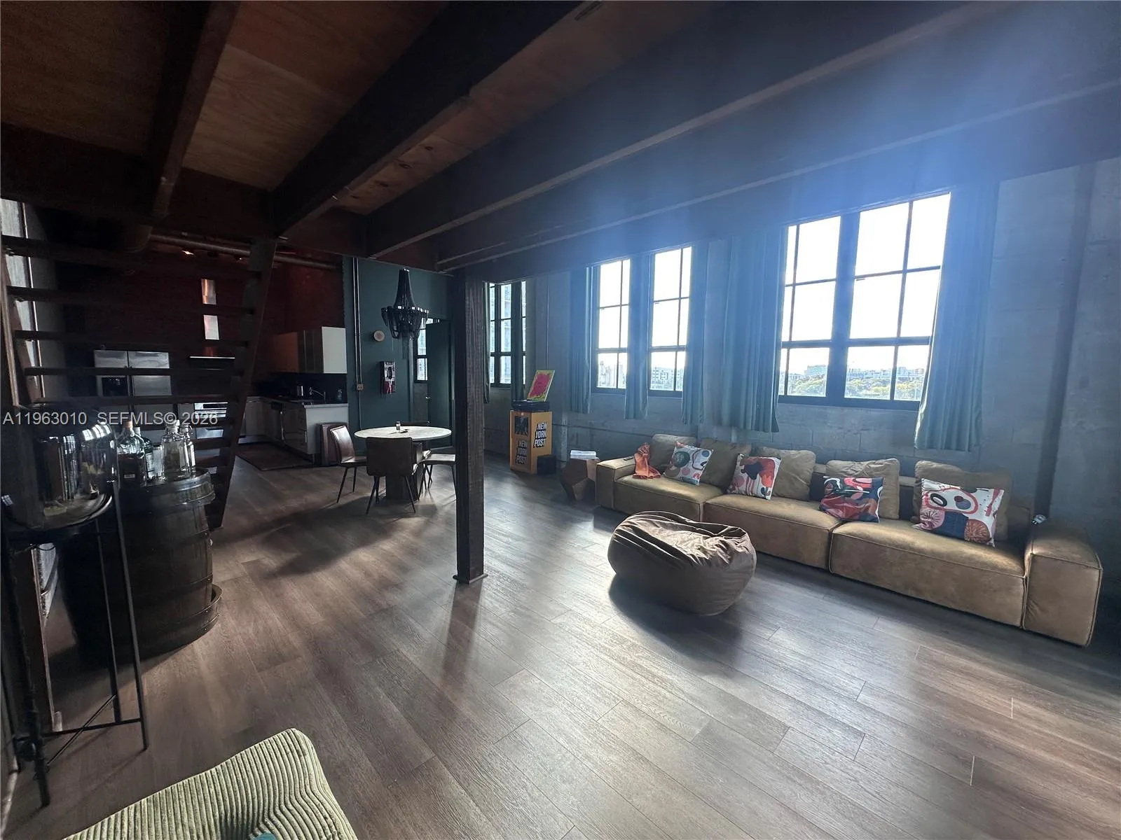 Authentic NYC-style corner loft with soaring 15-foot ceilings and a dramatic lofted sleeping area. Expansive windows flood the space with natural light, highlighting approx 1,000 sq ft of open-concept living plus a large open balcony. The sleek kitchen features Italian cabinetry, concrete countertops, and stainless steel appliances—perfectly blending industrial edge with modern design. Includes in-unit washer/dryer and one parking space. Parc Lofts, located between Wynwood, Edgewater, and Downtown, just minutes from Brickell and Miami Beach. Easy to show—contact listing agent. Furniture can be negotiated, furnished or not furnished.