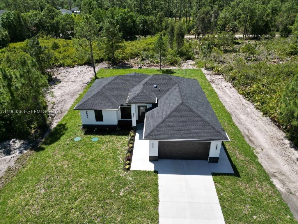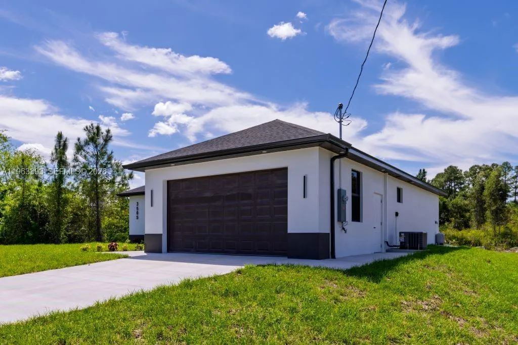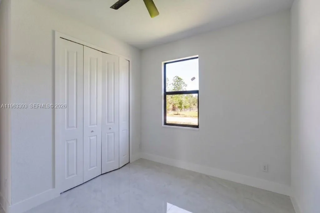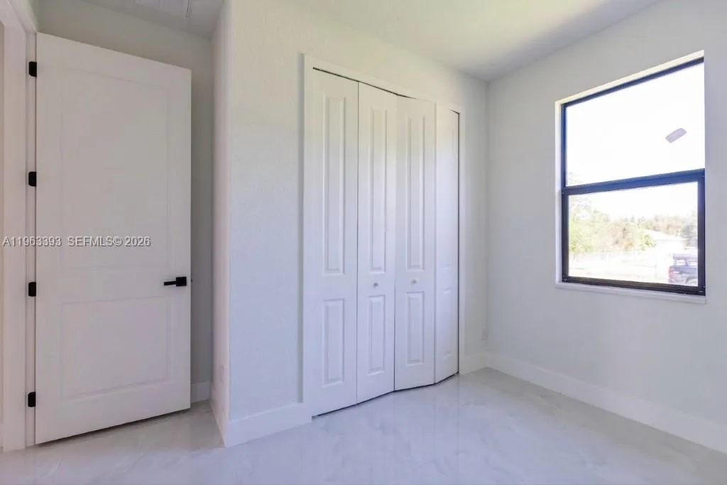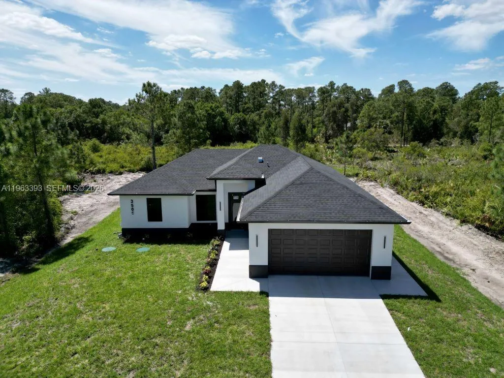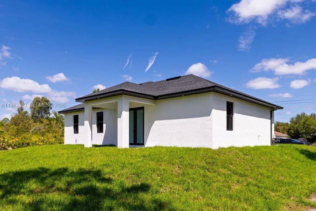 Brand New Construction!rnDiscover this stunning single-family home in Lehigh Acres, perfectly situated on a spacious 0.25-acre lot. This modern residence features 3 bedrooms and 3 full bathrooms, including one conveniently located in the garage, ideal for a future 4th bedroom, in-law suite, or rental efficiency.rnDesigned with quality and comfort in mind, the home offers impact-resistant doors and windows, central electric A/C, and ceiling fans in every bedroom for year-round comfort. The kitchen showcases a large island, ample pantry space, and sleek contemporary finishes, perfect for cooking and entertaining.rnEnjoy peaceful mornings or relaxing evenings on either the front or back porch. Each bathroom is tastefully upgraded with glass shower doors and LED light mirrors, adding a touch of luxury. All closets will include custom storage options, tailored to the buyer’s preferences.rnA perfect blend of comfort, style, and functionality. This home is move-in ready and waiting for your personal touch!