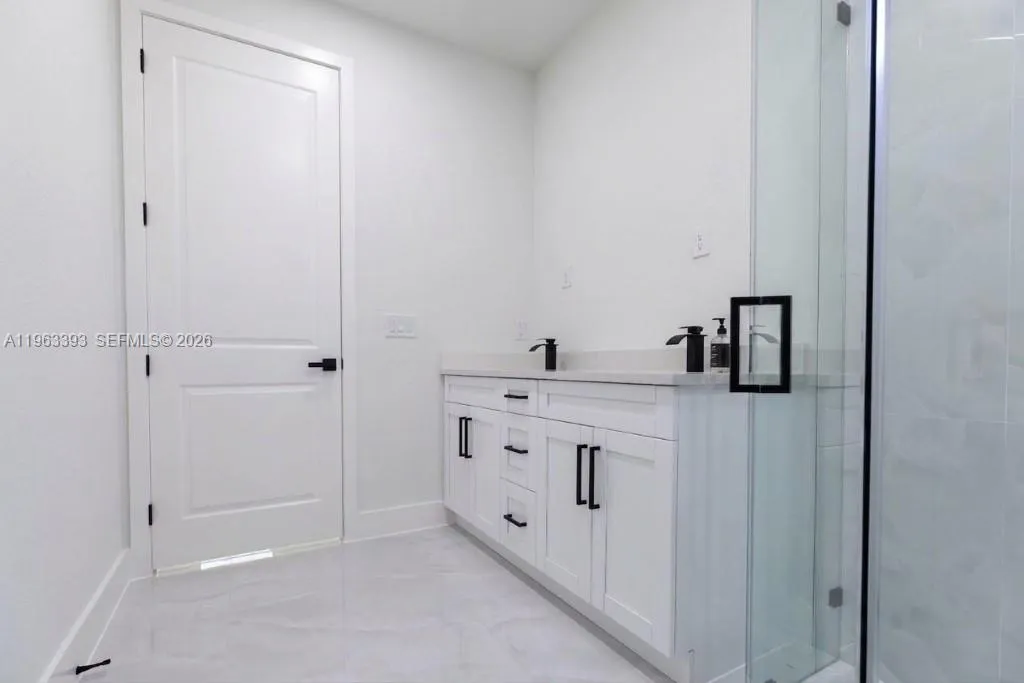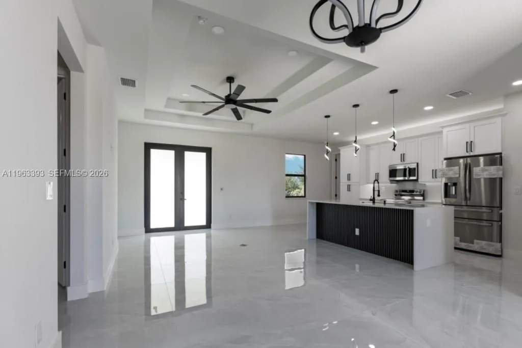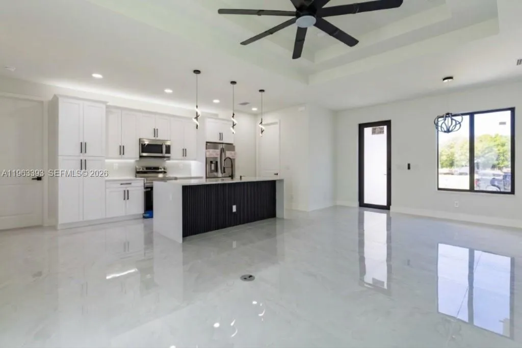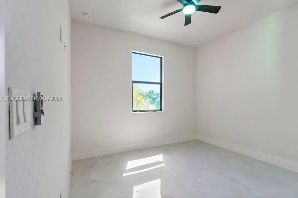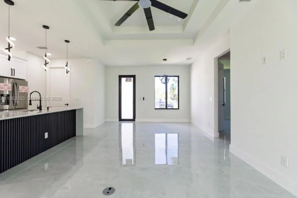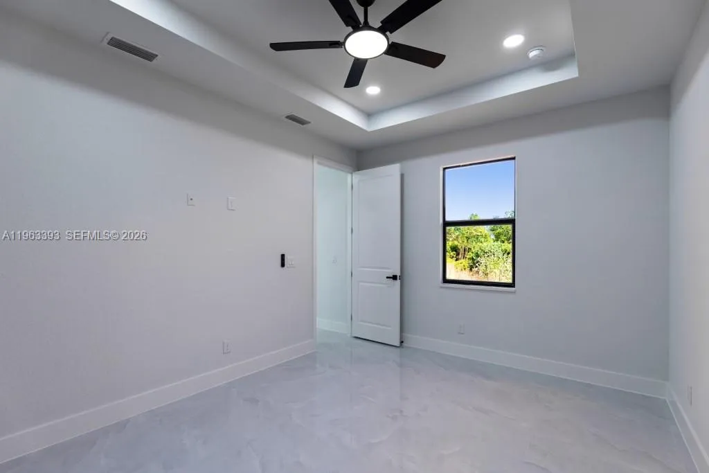 Brand New Construction!rnDiscover this stunning single-family home in Lehigh Acres, perfectly situated on a spacious 0.25-acre lot. This modern residence features 3 bedrooms and 3 full bathrooms, including one conveniently located in the garage, ideal for a future 4th bedroom, in-law suite, or rental efficiency.rnDesigned with quality and comfort in mind, the home offers impact-resistant doors and windows, central electric A/C, and ceiling fans in every bedroom for year-round comfort. The kitchen showcases a large island, ample pantry space, and sleek contemporary finishes, perfect for cooking and entertaining.rnEnjoy peaceful mornings or relaxing evenings on either the front or back porch. Each bathroom is tastefully upgraded with glass shower doors and LED light mirrors, adding a touch of luxury. All closets will include custom storage options, tailored to the buyer’s preferences.rnA perfect blend of comfort, style, and functionality. This home is move-in ready and waiting for your personal touch!