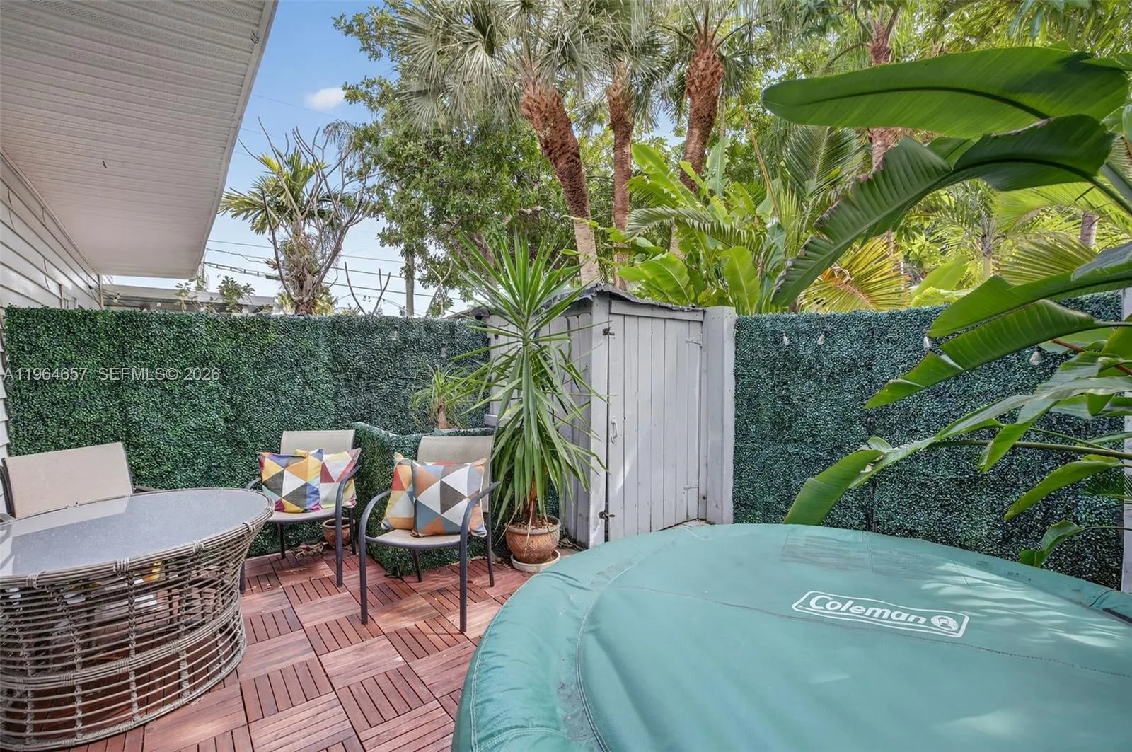 Beautifully updated 2-bedroom residence nestled along the Middle River in a prime central Fort Lauderdale location. Lush tropical foliage, privacy walls, and a private patio with hot tub create a serene, resort-style setting with exceptional privacy. Vaulted ceilings and porcelain flooring enhance the bright, open living space, while impact windows and doors offer peace of mind and energy efficiency. The home features a spacious primary bedroom with a true master bathroom suite and walk-in shower, ample storage throughout, and a well-appointed kitchen with stainless Whirlpool appliances. Enjoy access to a community pool within a fenced-in complex with security cameras and low HOA. Ideally located just 10 minutes to the beach and downtown Fort Lauderdale, walkable to the nearby entertainment district, and minutes from Colohatchee Park and a local boat ramp. A rare opportunity to own in a private, river-adjacent setting with unbeatable convenience.