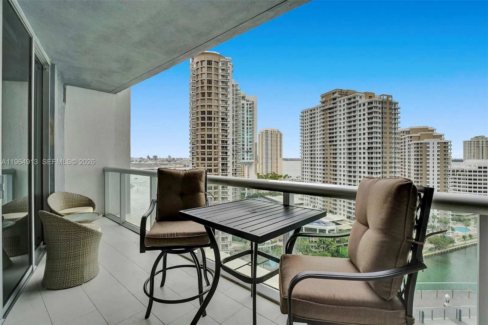 Direct Water View. 2 Bedrooms & a Den with a Murphy bed for occasional guests. Unit & furniture is in impeccable condition. Remodeled unit with many upgrades/custom buildouts. Marble flooring, Custom doors, Large built-out closets, Recessed lighting, Motorized Shades and much more. Icon Brickell boasts some of the best amenities one would experience. Largest pool & Jacuzzi around, pool service, Gorgeous full service Spa w steam & sauna, Full fitness gym w/ classes included, Billiard/Chess/Poker rooms, 24 hours security, valet, etc… Located on site are 3 upscale restaurants, 2 cafes & a convenient store. Whole foods supermarket a short walk away. Rental rate includes Cable, Internet, Water, Trash, 1 Garage space & access to all amenities. Please note, the low rent this year is due to the balcony being locked out. The view can still be enjoyed from inside the unit, but can not access the balcony due to building doing some work on exteriors. Pool is open Friday – Sunday, closed Monday – Thursday due to the ongoing building project.