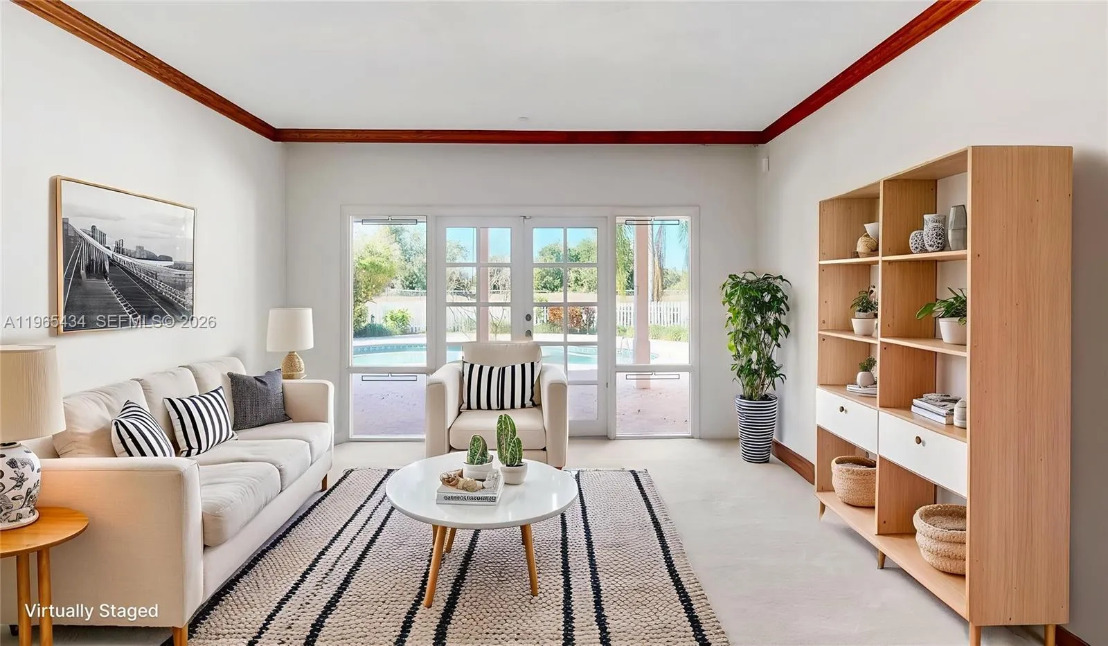 Experience the height of Calusa living in this sprawling residence designed for luxury and entertaining. The standout kitchen is a true showpiece, featuring cherrywood cabinetry, a Jenn-Air cooktop, double ovens, a wine cooler, and stunning onyx backsplashes. Throughout the home, crown molding and French doors create an atmosphere of timeless elegance, while the family room offers a cozy retreat with a wood-burning fireplace, soaring wooden beam ceilings, and a full wet bar. The primary suite serves as a private sanctuary, boasting a whirlpool jet tub, Kohler fixtures, and direct access to the lanai. Outside, your personal tropical oasis awaits, featuring a shimmering pebble-tech pool and an expansive brick-paver patio. Perfectly located just minutes from the Turnpike, Costco, Publix, and top-tier dining and schools, this home offers an unparalleled lifestyle.