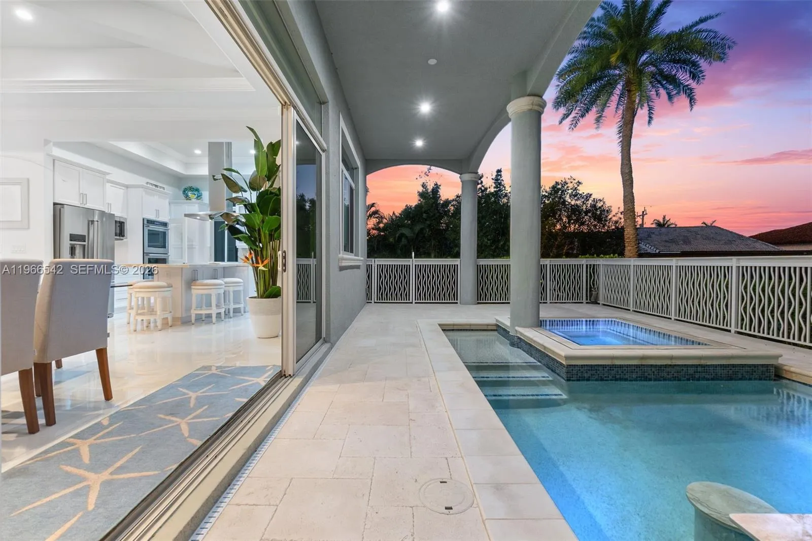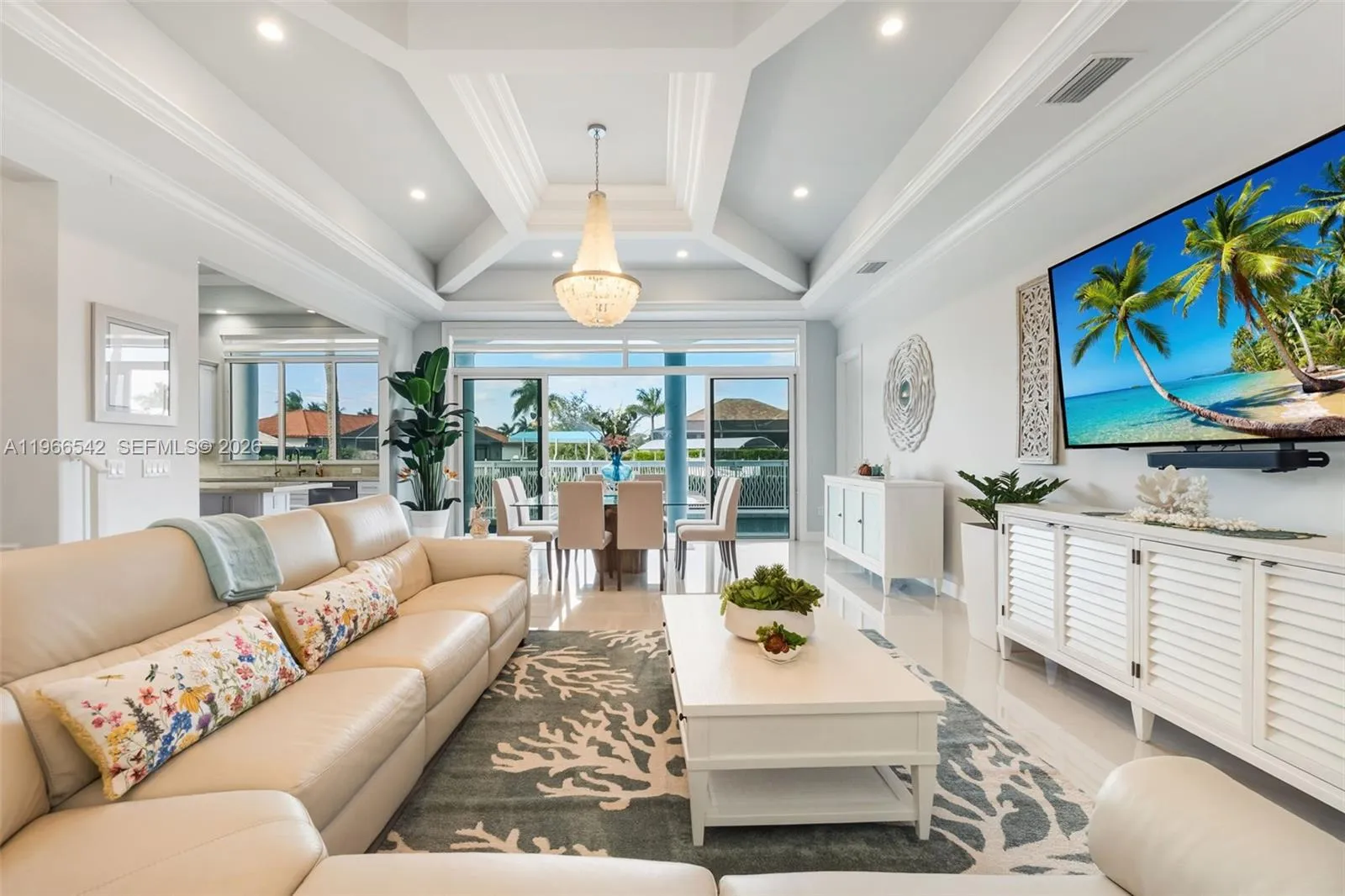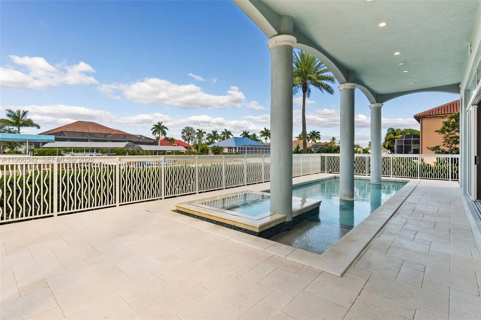 Luxurious fully furnished Marco Island waterfront residence, professionally decorated and move-in ready. This 4-bedroom, 4-bath home blends refined design with effortless coastal living, showcasing tranquil channel views and water access with potential for dock addition.rnrnSoaring 24-foot ceilings, porcelain flooring throughout the home and balconies, wood crown moldings, and custom coffered ceilings create a grand yet inviting interior. The open-concept living and dining areas are filled with natural light and designed for entertaining. The chef’s kitchen features KitchenAid Architect Series appliances and Taj Mahal Brazilian stone countertops, while all bathrooms and the laundry room are finished in white quartz. Custom built-in closets, impact windows and doors, barrel tile roof, exterior camera system, elevator, and dual AC units add comfort and peace of mind.rnrnThe entire second floor is dedicated to the private primary suite with sitting area, spa-style bath, and oversized closet, while a first-floor junior ensuite is ideal for guests or multigenerational living.rnrnOutdoors, enjoy a resort-style setting with a heated Pentair pool and spa on an expansive deck overlooking the water, plus convenient pool bath access. A paver driveway and two-car garage complete the property.rnrnExperience the Marco Island lifestyle with boating, sunsets, and year-round entertaining in a home designed for luxury and relaxation.