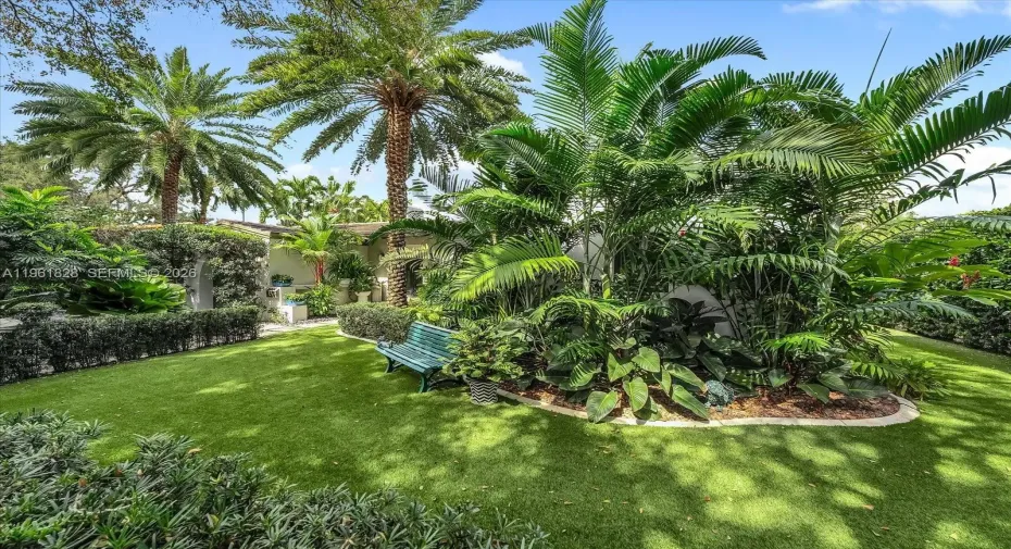 Fully furnished and nestled on a quiet Coral Gables street just minutes from downtown and Merrick Park, this refined 4-bedroom, 3-bath residence offers 2,948 living sq ft, 3,680 total sq ft, on a 9,000 SF lot. Light-filled interiors showcase engineered wood floors, wood-paneled ceilings with exposed beams, plantation shutters, and impact windows and doors, creating a warm yet sophisticated ambiance. The open-concept custom kitchen flows seamlessly into the family room with a built-in media center and features an expansive island with sink, storage, and dishwasher, complemented by Fisher & Paykel refrigerator, double wall ovens, microwave, and 5-burner gas range with hood. The primary suite is a private retreat with a sitting area and an illuminated custom walk-in closet with center island, linen storage, and makeup vanity. The spa-inspired bath offers dual vanities with LED mirror, a freestanding soaking tub, frameless glass shower, and separate washroom with smart toilet. Outdoors enjoy true Florida living, award-winning landscaping (Coral Gables 2022 Landscape Beautification Award), a custom pool with slate deck, raised mosaic waterfall wall, sculptural fountain, manicured privacy hedge, and an automatic louvered pergola shading a chic lounge area furnished with West Elm outdoor furniture. Additional features include a one-car garage, gravel driveway, whole-house generator, Nest thermostats, two A/C units, keypad entry, and timed exterior lighting.