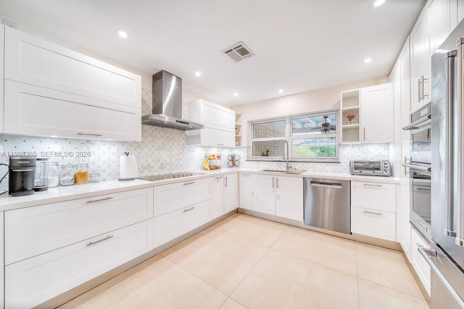 Tucked beneath majestic oak trees and filled with natural light, this beautifully renovated home offers exceptional indoor-outdoor living in a highly desirable neighborhood close to Coral Reef Park, and A-rated schools.The backyard is a true retreat, featuring a resurfaced pool with a rare 9-foot depth, perfect for entertaining or relaxing. An outdoor kitchen and bar area, new turf, and lush clusia hedges provide privacy and an inviting setting, while landscape lighting highlights both the front and back yards for stunning evening ambiance.Inside, nearly the entire home has been thoughtfully updated. Oversized 3’ x 3’ tile flooring flows throughout, creating a seamless, modern feel. The 2018 kitchen renovation includes quartz countertops, custom cabinetry with Blum soft-close hardware, under-cabinet lighting, lazy Susan, spice rack, and updated appliances. Major upgrades include a new roof, hurricane-impact windows and doors, updated plumbing, added insulation, recessed lighting, and multiple A/C systems, including a mini-split in the back bedroom.The remodeled hall bath features new tile, tub, vanity, and fixtures, laundry area includes a sink and stackable washer/dryer.Additional highlights include a turf-and-concrete driveway, and updated front porch tile. Friendly neighbors and a strong sense of community complete the experience.Move-in ready and designed for both comfort and entertaining—this home is a must-see.