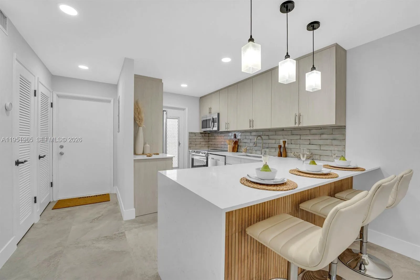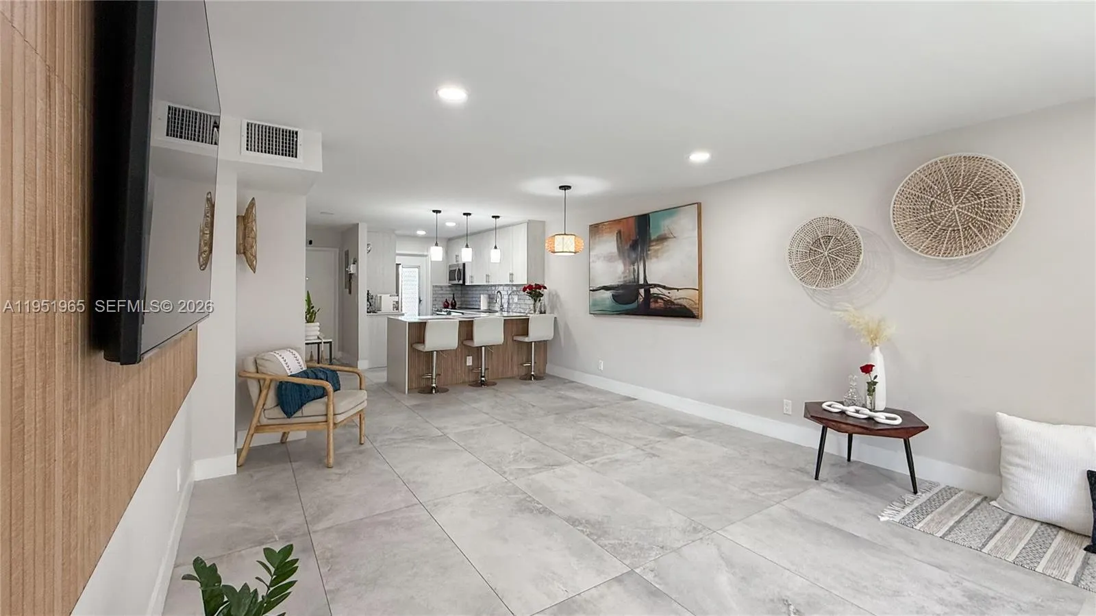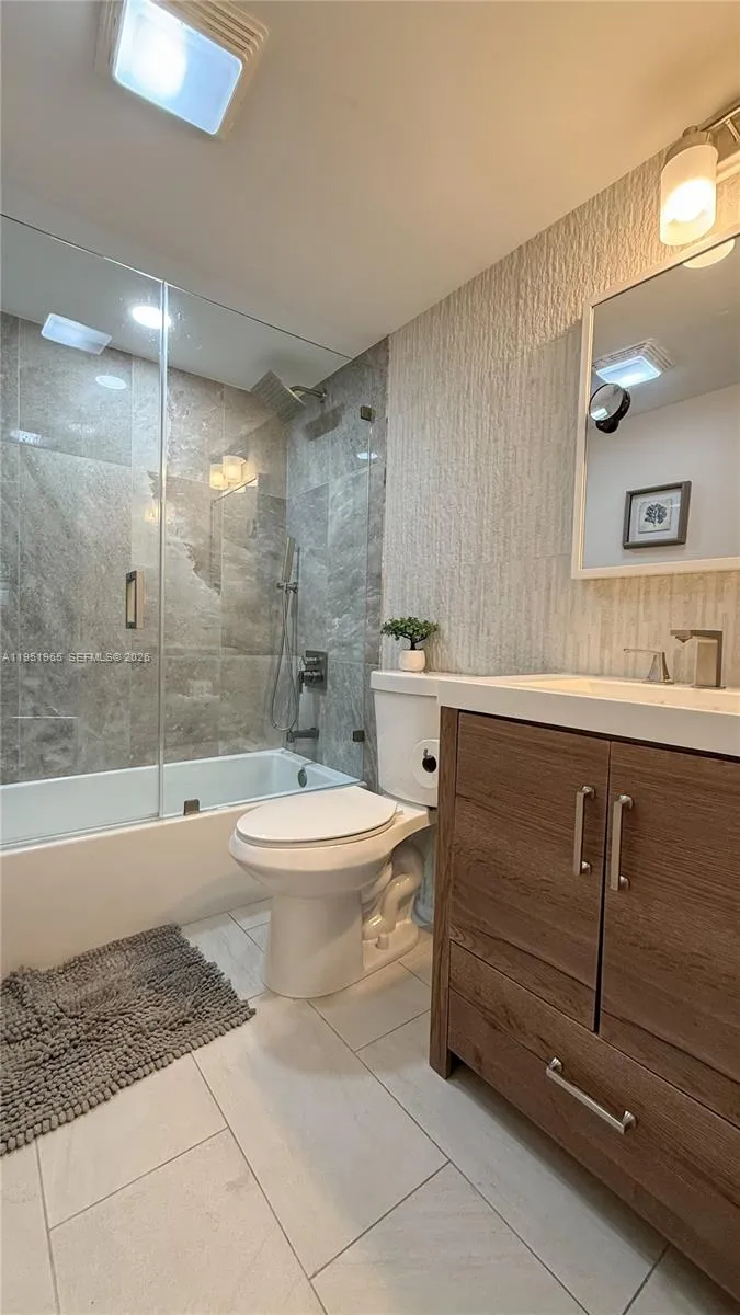 Fully renovated 2/2 featuring an open floor plan, tile flooring throughout, and a modern expanded kitchen with new stainless-steel appliances, extended bar, and upgraded lighting. Wall expanded for larger fridge and added cabinetry; ceiling lowered for recessed lights in kitchen, dining, and living areas. Master bedroom entry repositioned for better flow. Includes custom walk-in closets, TV panel for 60” TV, and new patio screens.rnrnUpdates: New electrical panel, A/C ~6 years old, water heater ~13 years old, fresh paint, Nest thermostat, and hurricane shutters.
