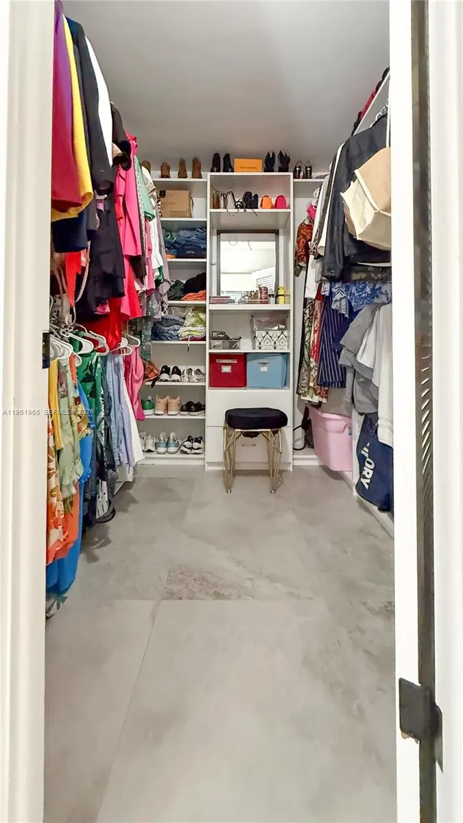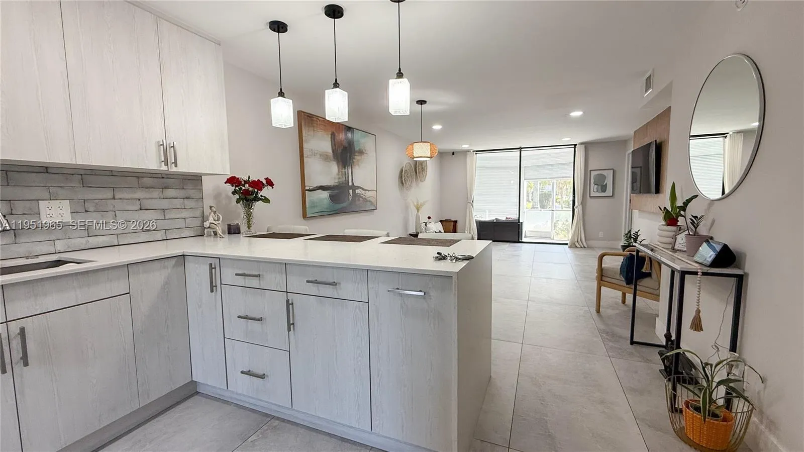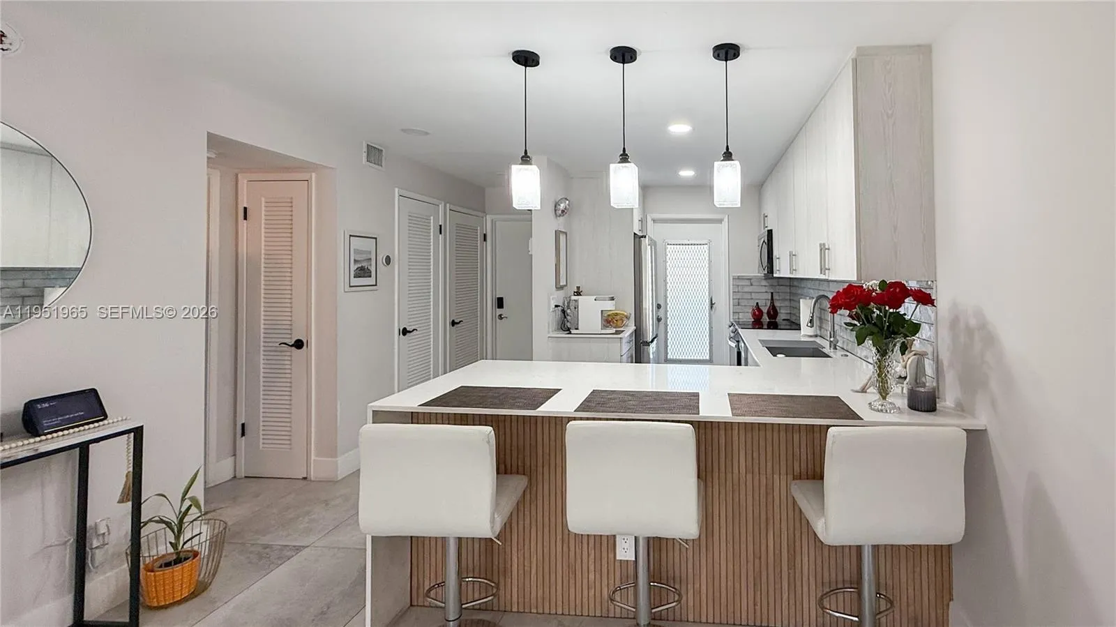 Fully renovated 2/2 featuring an open floor plan, tile flooring throughout, and a modern expanded kitchen with new stainless-steel appliances, extended bar, and upgraded lighting. Wall expanded for larger fridge and added cabinetry; ceiling lowered for recessed lights in kitchen, dining, and living areas. Master bedroom entry repositioned for better flow. Includes custom walk-in closets, TV panel for 60” TV, and new patio screens.rnrnUpdates: New electrical panel, A/C ~6 years old, water heater ~13 years old, fresh paint, Nest thermostat, and hurricane shutters.