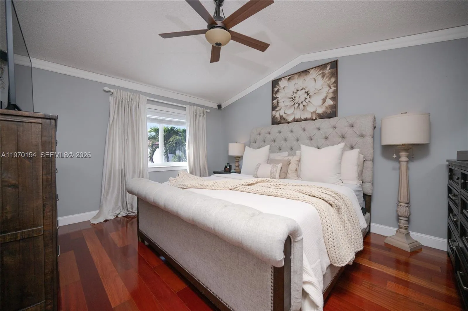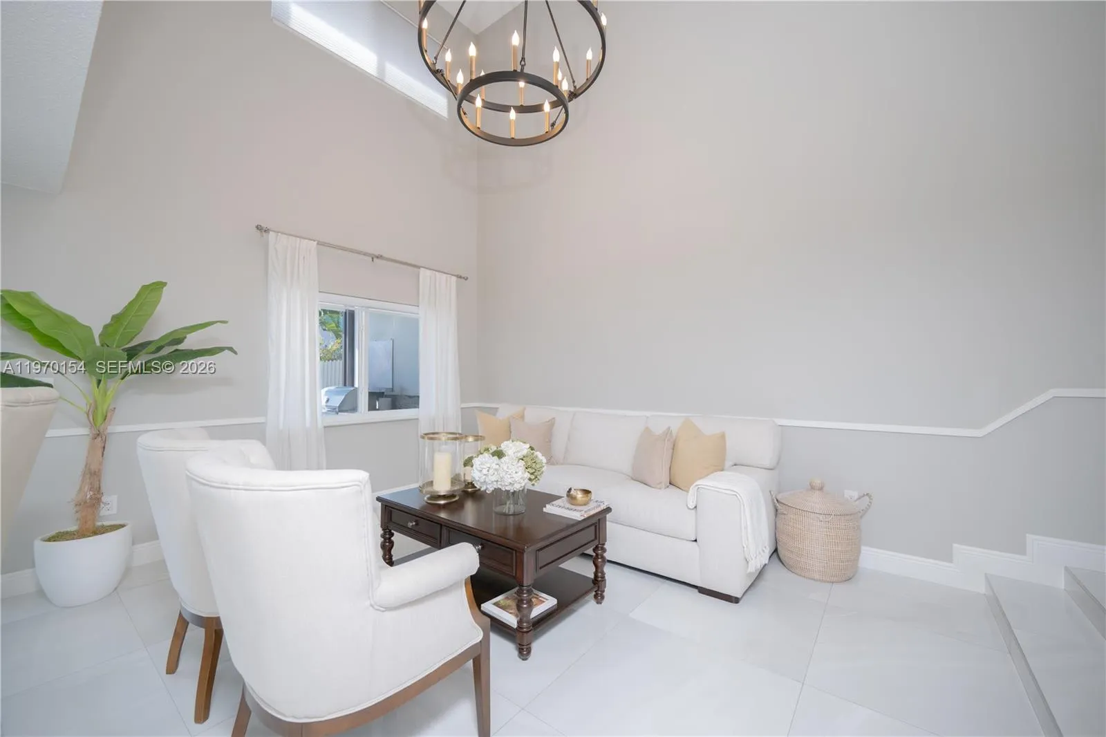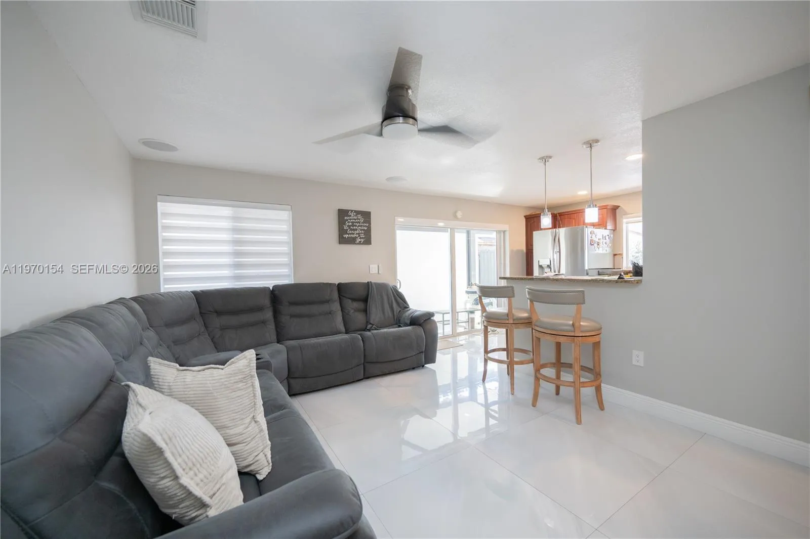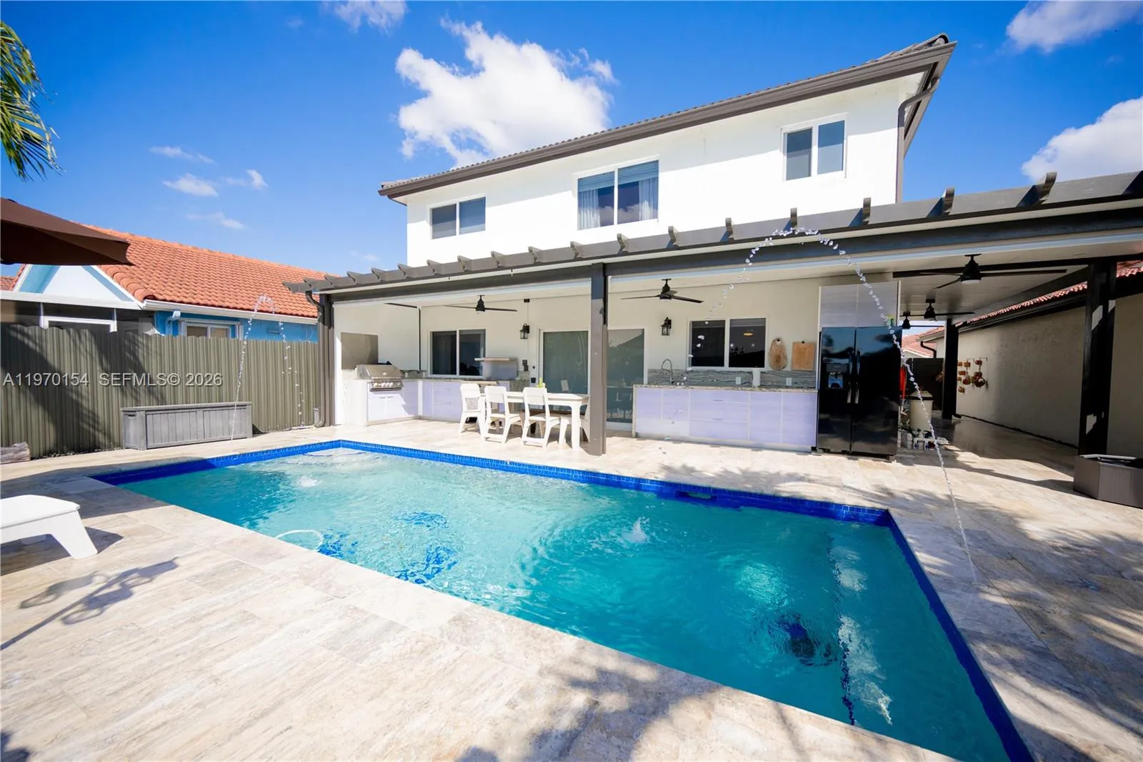 Fully remodeled 2-story 4BD/2.5BA pool home with 2-car garage, offering soaring high ceilings and elegant 32” x 32” porcelain tile flooring throughout the main living areas. The modern metal and wood staircase creates a striking focal point, while the second floor showcases stunning Bella Wood Brazilian Cherry hardwood flooring. Home features full impact windows, two impact sliding glass doors, and a contemporary impact front entry door for added security and energy efficiency. The family room includes built-in ceiling surround sound, perfect for entertaining. Enjoy a private backyard oasis with a saltwater pool system, energy-efficient variable speed Pentair pump, custom BBQ island with built-in electric refrigerator, two remote-controlled awnings with auto-retract rain sensors, and exterior sound system. Excellent location close to everything. Truly turnkey and move-in ready, just bring your clothes and start enjoying from day one! Watch the full property tour on YouTube, the link is included in this listing. Showings by appointment only