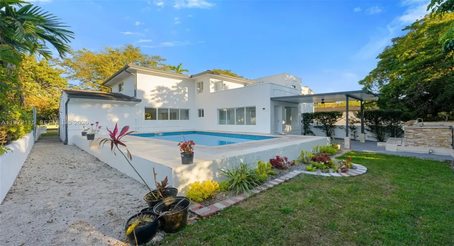 Refined two-story residence in North Coral Gables, set along a peaceful canopy-lined residential stretch. Blending modern finishes with architectural character, this home features designer waterproof rigid-core flooring throughout sleek, durable and ideal for everyday living. The layout offers 3 generously sized bedrooms and 2 bathrooms, plus a versatile ground-floor flex room that can easily function as a 4th bedroom, private office, media room or formal dining space. Natural light pours in through full impact windows and doors, enhancing the home’s clean, contemporary aesthetic. Upstairs, a rare and expansive private terrace creates the perfect setting for morning coffee, sunset gatherings, or elevated entertaining under the open sky.The backyard is designed for true Florida living, featuring a 9-foot-deep in-ground pool, lush landscaping, a detached storage structure, and a covered patio with a built-in barbecue station ideal for hosting and weekend relaxation. A spacious driveway and freshly updated one-car garage provide convenience and additional storage. Major upgrades include a new roof (2022), new fascia and gutters, and impact protection throughout for comfort and peace of mind. Located just minutes from downtown Coral Gables, Miracle Mile, Granada Golf Course, the Biltmore, University of Miami and Miami International Airport, this home delivers lifestyle, location and long-term value. Move-in ready with a modern look and standout features rarely found in this area.