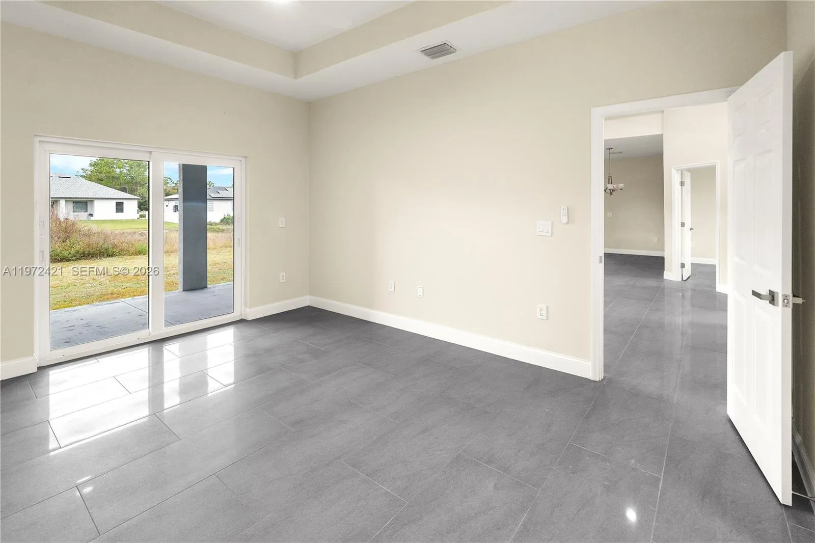 Welcome to this brand-new 2024 construction home located in the heart of Lehigh Acres, now available for rent. This stunning 3 bedroom + den, 2 bath residence features a modern open floor plan with elegant gray tile flooring throughout and tray ceilings that enhance the bright, airy feel of the home. The spacious great room flows seamlessly into the beautifully designed kitchen, complete with soft-close cabinets, granite countertops, stainless steel appliances, decorative backsplash, and an oversized island, ideal for entertaining or everyday living. The home offers two master suites, each with walk-in closets, dual sinks, and walk-in showers, providing privacy and flexibility for families or shared living. Large windows and recessed lighting fill the space with natural light, while the open lanai overlooks a peaceful freshwater canal, creating the perfect outdoor retreat. Built with solid concrete block construction, this property includes an attached 2-car garage, well and septic system, and sits on a generous lot with room to enjoy outdoor living. Located in a quiet area yet conveniently close to shopping, schools, and major roadways, this move-in-ready rental offers the perfect blend of modern style, comfort, and space.