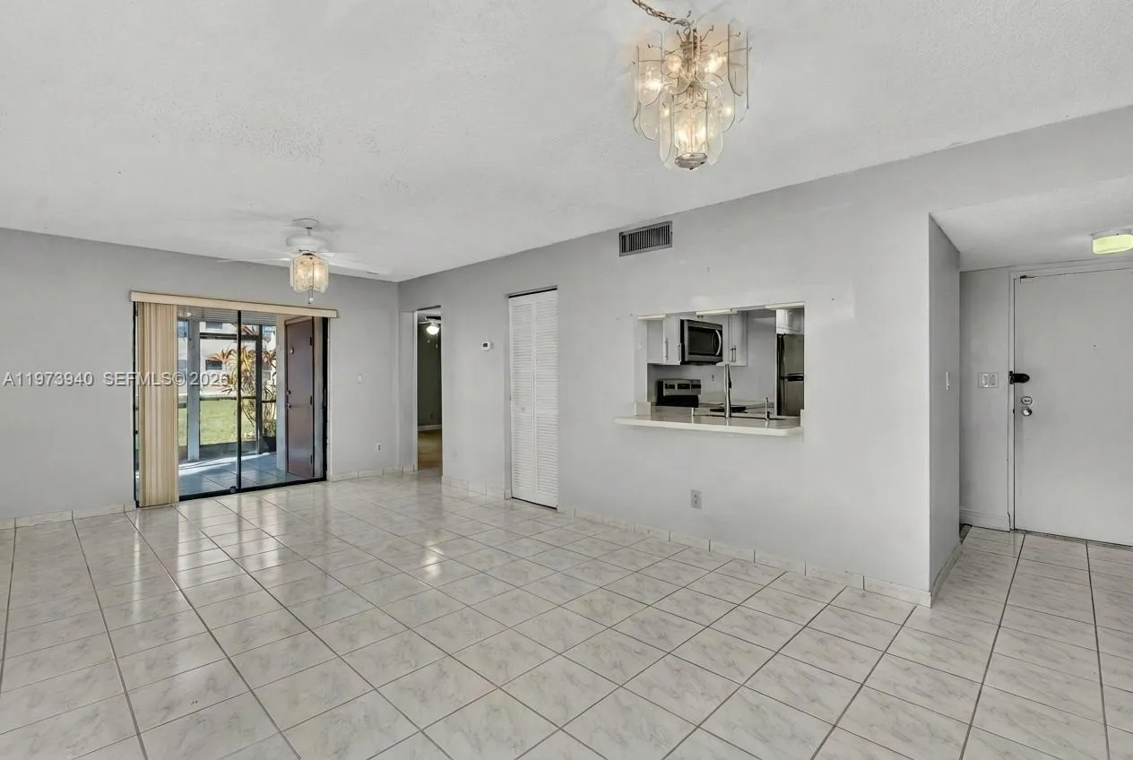 Spacious 3 bedroom, 2 bath first floor condo offering 1,070 sq ft one of the largest floor plans in the community. This well designed layout features a remodeled kitchen (2025) with modern cabinetry, updated countertops, and brand-new stainless steel appliances (2025). The water heater was replaced in 2025. The open living and dining area offers tile flooring throughout the main spaces and sliding doors leading to a screened/open porch overlooking a garden area, creating a comfortable indoor-outdoor feel with added greenery and privacy. The primary suite includes an updated bathroom, while the additional bedrooms are generously sized with ample closet space. In-unit washer and dryer provide everyday convenience. Partial hurricane shutters add extra protection.rnrnThe association includes water, sewer, and trash, and residents enjoy access to a community pool. With no rental restrictions and close proximity to major highways, shopping, dining, and everyday essentials, this property offers space, flexibility, and strong potential in a convenient Miramar location.