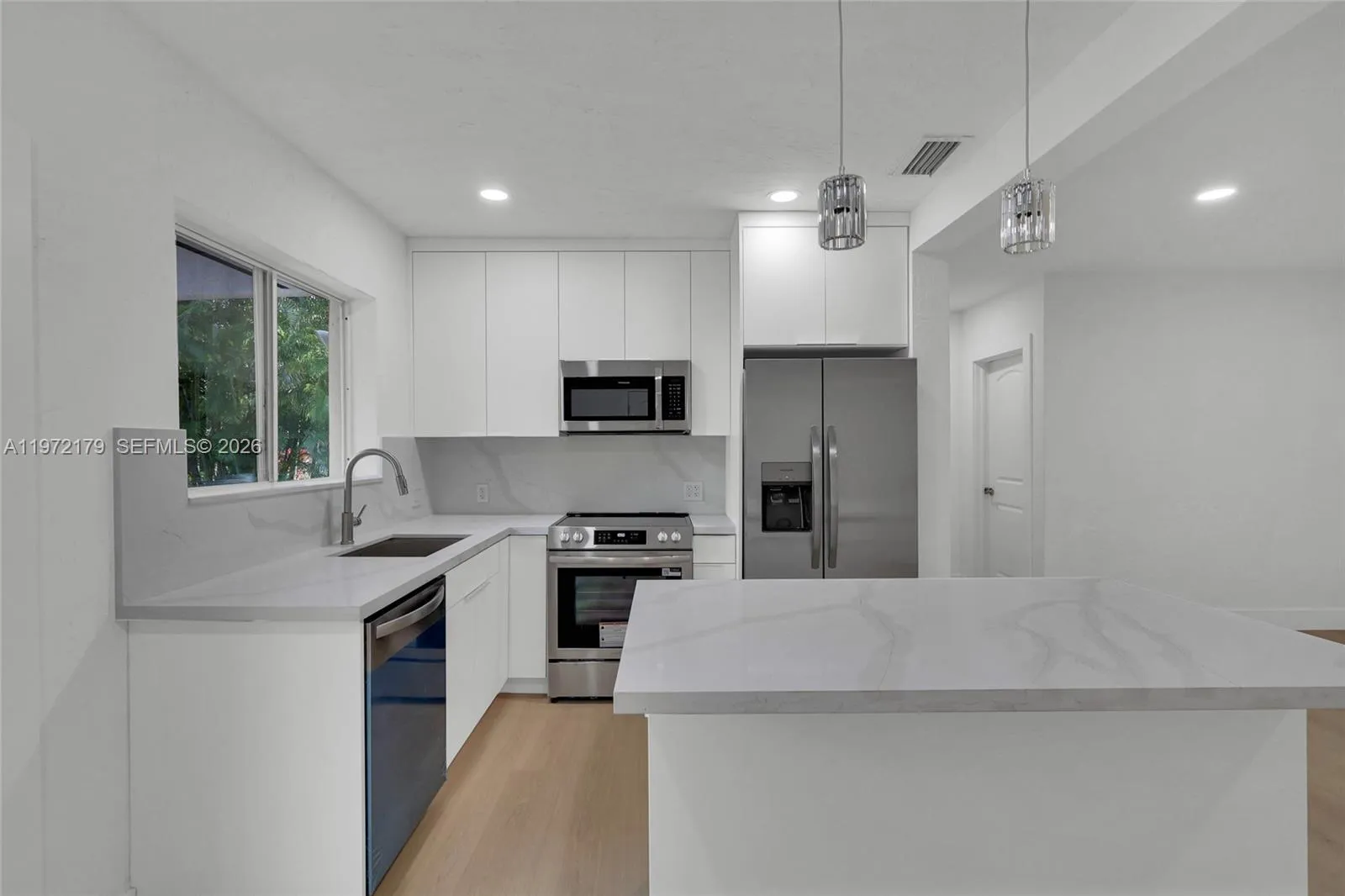 Beautiful 3-bedroom, 2-bathroom home in the heart of South Miami. This move-in ready residence features a spacious and functional layout with a large living room, dedicated dining area, and abundant natural light. Modern wood-style flooring, recessed lighting, and contemporary finishes throughout.rnrnThe updated kitchen offers quartz countertops, sleek cabinetry, and stainless steel appliances. The primary bedroom includes a private en-suite bathroom and walk-in closet. Two additional bedrooms are generously sized and share a second full bathroom. Separate laundry room for added convenience.rnrnSituated on an expansive lot with a large private yard surrounded by mature trees, providing a peaceful and secluded outdoor setting. Located on a quiet residential street, just minutes from the University of Miami, Coral Gables, South Miami shops and dining, top-rated schools, and major roadways.