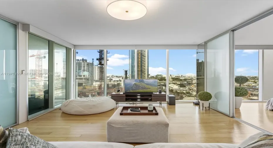 Live elevated at one of Miami’s most sought-after boutique luxury towers, Ten Museum Park, a landmark Downtown residence designed by award-winning architect Chad Oppenheim. A spacious 2-bedroom, 2-bath split floor plan showcasing breathtaking views of the Miami skyline through dramatic floor-to-ceiling impact glass. Perfectly positioned adjacent to and overlooking one of the world’s most iconic architectural masterpieces by Zaha Hadid — the stunning One Thousand Museum — this residence offers a rare front-row seat to globally celebrated design. The open-concept layout is ideal for entertaining, with a generous living area flowing seamlessly to a private balcony capturing sparkling city views. Sliding frosted glass doors provide privacy for both bedrooms while maintaining natural light throughout. The sleek kitchen is appointed with stainless steel appliances, top of the line cabinetry, and countertops, blending modern elegance with functionality.Located directly across from Museum Park and steps to the Pérez Art Museum Miami, Phillip and Patricia Frost Museum of Science, Kaseya Center, and Biscayne Bay residents enjoy unmatched walkability and cultural access. Five-star amenities include sunrise and sunset pools, resistance and cold plunge pools, jacuzzi, full-service spa, two fitness centers plus spin and yoga studio, 24-hour concierge, valet parking, and on-site management. Iconic architecture, resort-style amenities, and premier location define this exceptional offering.