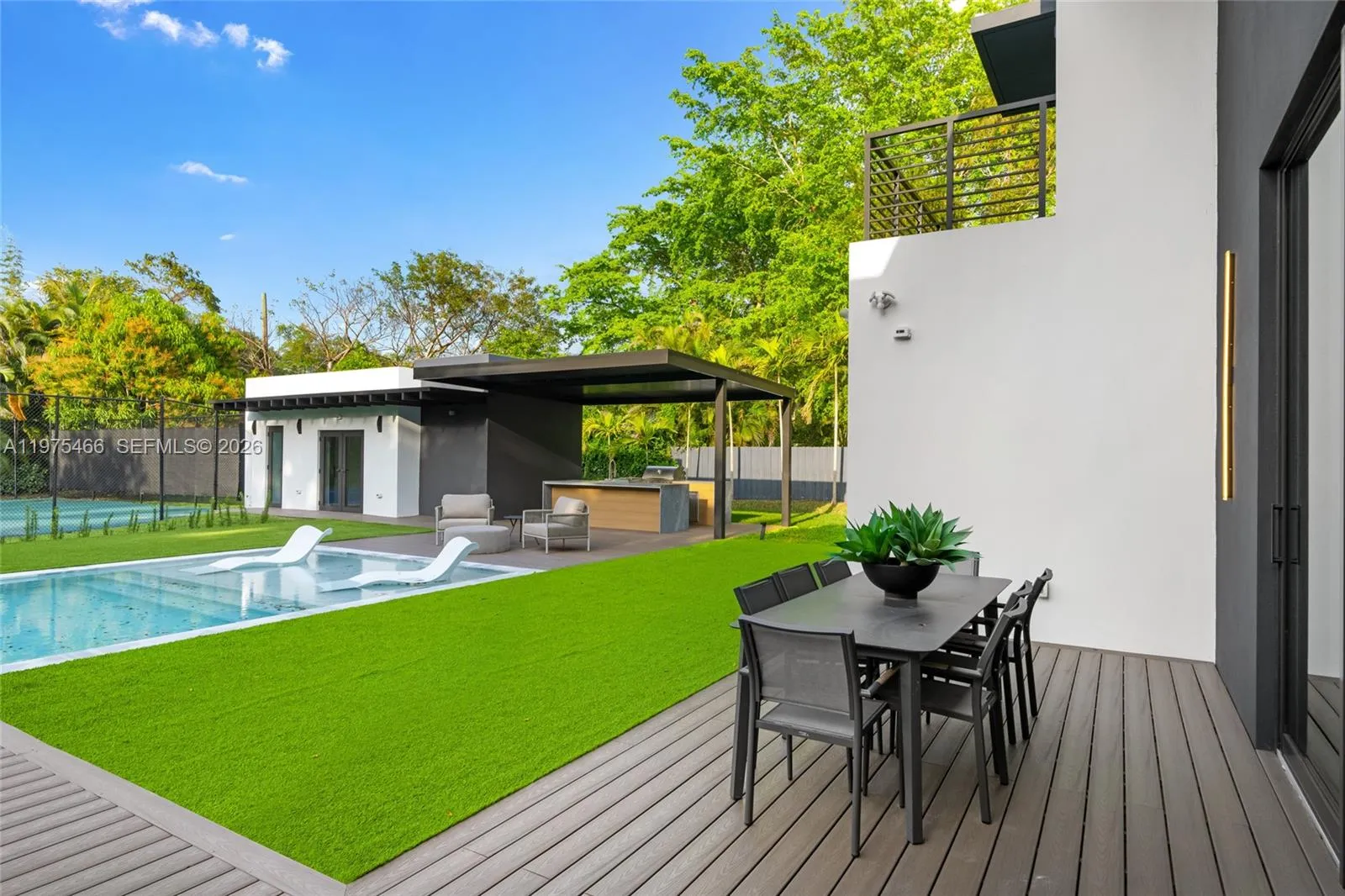 Welcome to a stunning new luxury home in the heart of Pinecrest. This expansive estate offers 8,673 sqft of living space with 7 beds and 7.5 baths in the main house, and a 1/1 guest house. Enter via a floating bridge flanked by water features, leading to elegant interiors with hardwood and tile floors, custom lighting, and a chef’s kitchen featuring premium appliances. The primary suite includes a custom walk-in closet, marble-clad bath, and a hidden safe room. A concealed media room adds flexible space for a theater, studio, or playroom. Additional features include a wine cellar area, elevator shaft, laundry room, and a private backyard with a pool, lighted tennis court, 3 balconies, and lush landscaping with fruit trees. This extraordinary home offers the ultimate in luxury and privacy.