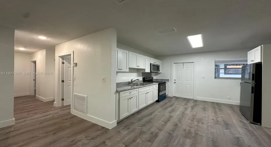 Brand-new, charming 2BR/2BA apartment in Hallandale Beach, meticulously remodeled to embody comfort and style. Every detail feels like home, with new elegant finishes throughout—sparkling granite countertops, brand new, high-end appliances, with beautiful lighting and flooring. The spacious, first-floor corner unit boasts an open, welcoming layout perfect for gatherings and entertaining, complemented by big rooms and walk-in closets for ample storage. Has a private laundry/utility room with washer & dryer hookup. Unit includes 1 assigned parking space. Situated in a perfect location in a quiet community with easy access to parks, beaches, shopping & dining. This is a true Hallandale gem—a haven of newness, spaciousness & convenience, where every detail makes you feel right at home.