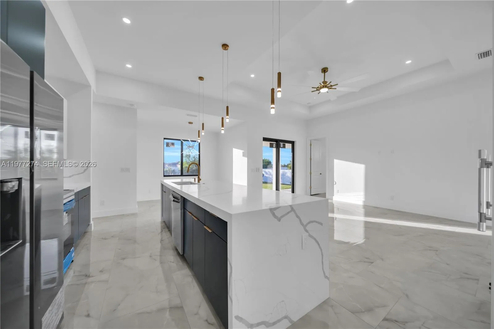 Modern Elegance Meets Florida Living! Discover this stunning brand-new construction in Cape Coral with 1,655 sq. ft. of thoughtfully designed living space. This home features 3 bedrooms + den/office, 2 full bathrooms, and a 2-car garage. Bright, open interiors flow from living and dining areas to a sleek kitchen with quartz countertops and stainless steel appliances. The primary suite redefines luxury with a spa-inspired bath, floor-to-ceiling blue marble-style porcelain, dual rainfall showers with gold fixtures, a freestanding soaking tub, and ambient LED lighting. Conveniently near schools, shopping, parks, and main roads, this home combines design, comfort, and location.rnSeller contributes to closing costs. Schedule your showing today!