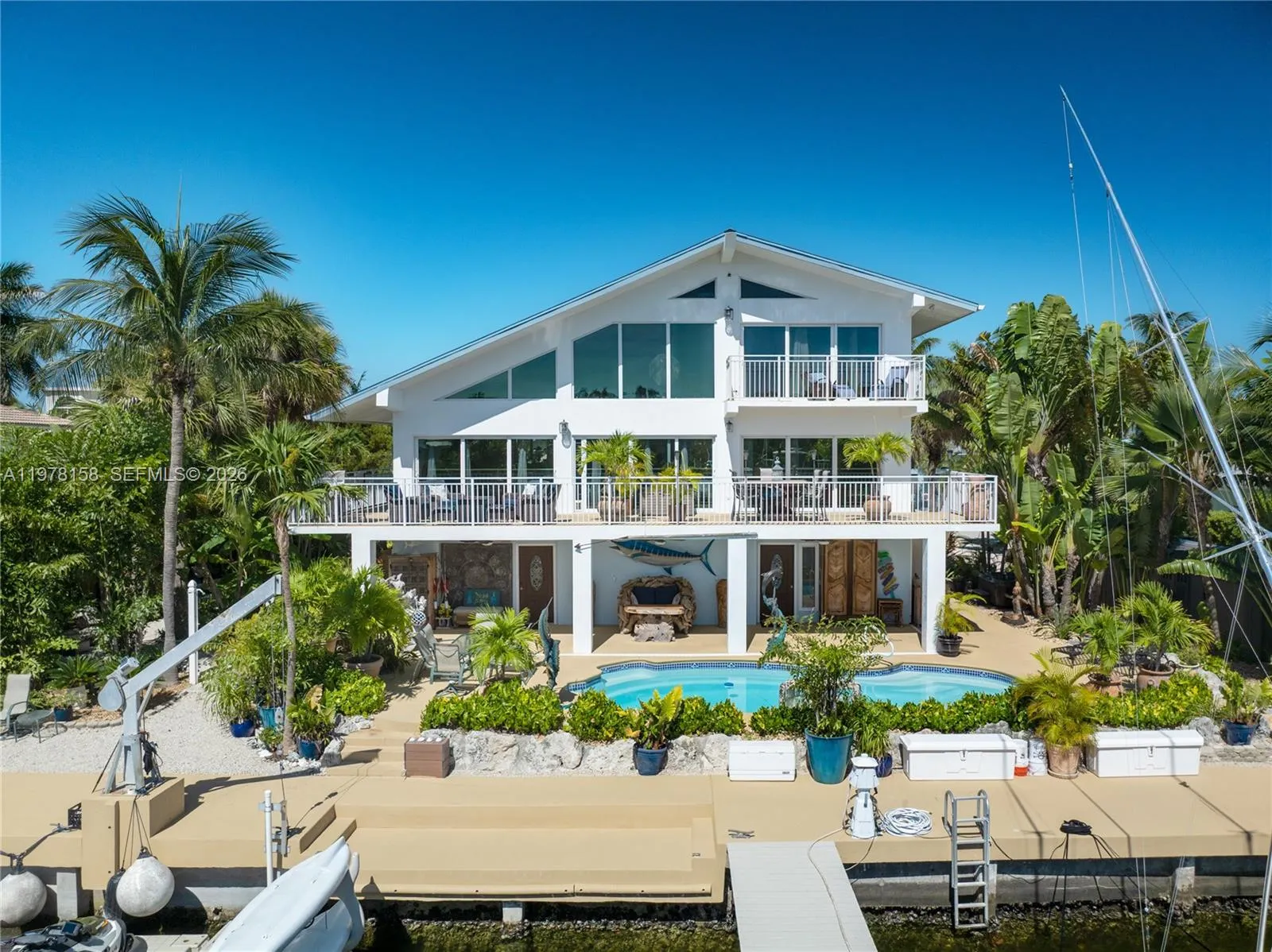 A rare waterfront estate along a 200-foot wide canal with a 110-foot dock and direct ocean access, capturing the essence of Florida Keys living. Spanning over 3,200 square feet, this residence features four bedrooms and three-and-a-half baths, ideal for hosting family and guests in true island style.rnInside, a dramatic grand staircase and soaring two-story great room create an inviting yet refined atmosphere. Walls of windows frame tranquil water views and fill the space with natural light, providing the perfect setting for entertaining or relaxing after a day on the water. The kitchen offers granite countertops, stainless steel appliances, and an open layout that seamlessly connects the living and dining areas.rnOutside, your private waterfront retreat awaits. The 110-foot concrete dock with dual 40-foot finger piers provides exceptional deep-water dockage for multiple vessels, including large yachts, with quick Atlantic access. Boaters will appreciate the floating jet ski and kayak docks, davits, fish-cleaning station, and ice machine.rnSurrounded by lush tropical landscaping, the heated pool and spa create a secluded oasis where island breezes and sunshine define everyday living. Whether enjoying mornings on the water, afternoons poolside, or evenings under the stars, this property delivers the luxury and lifestyle of the Florida Keys.