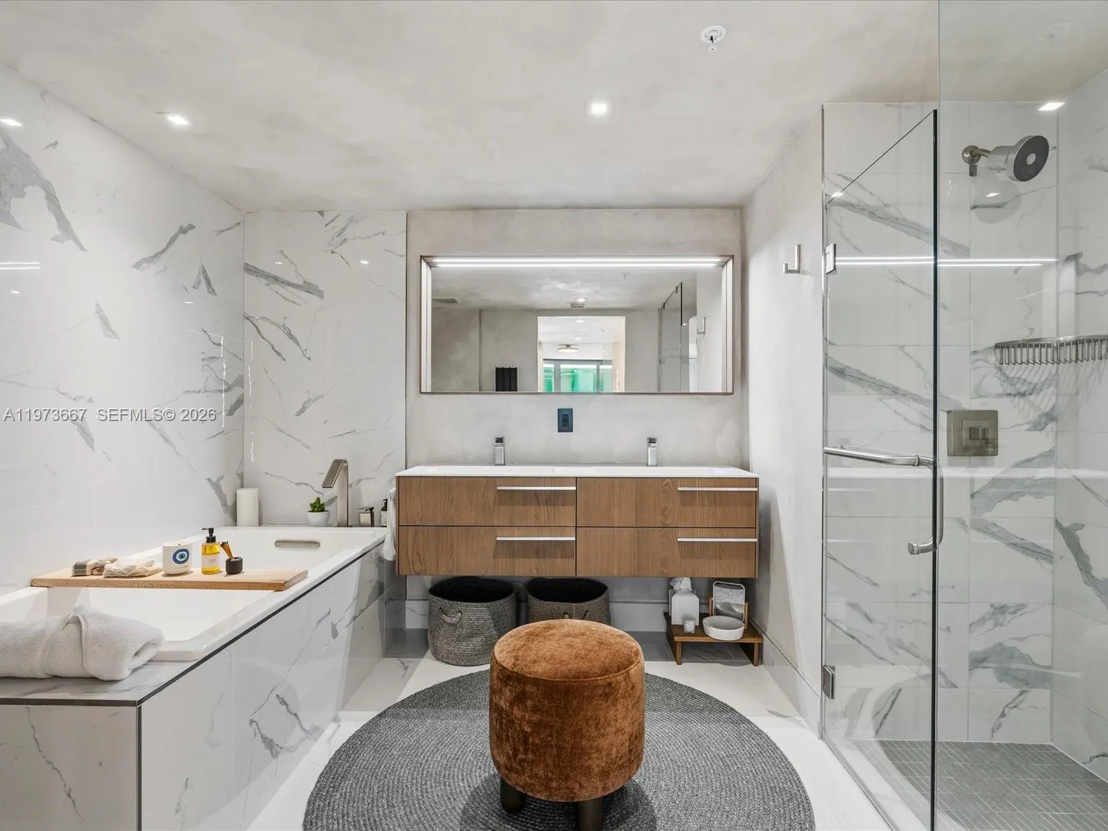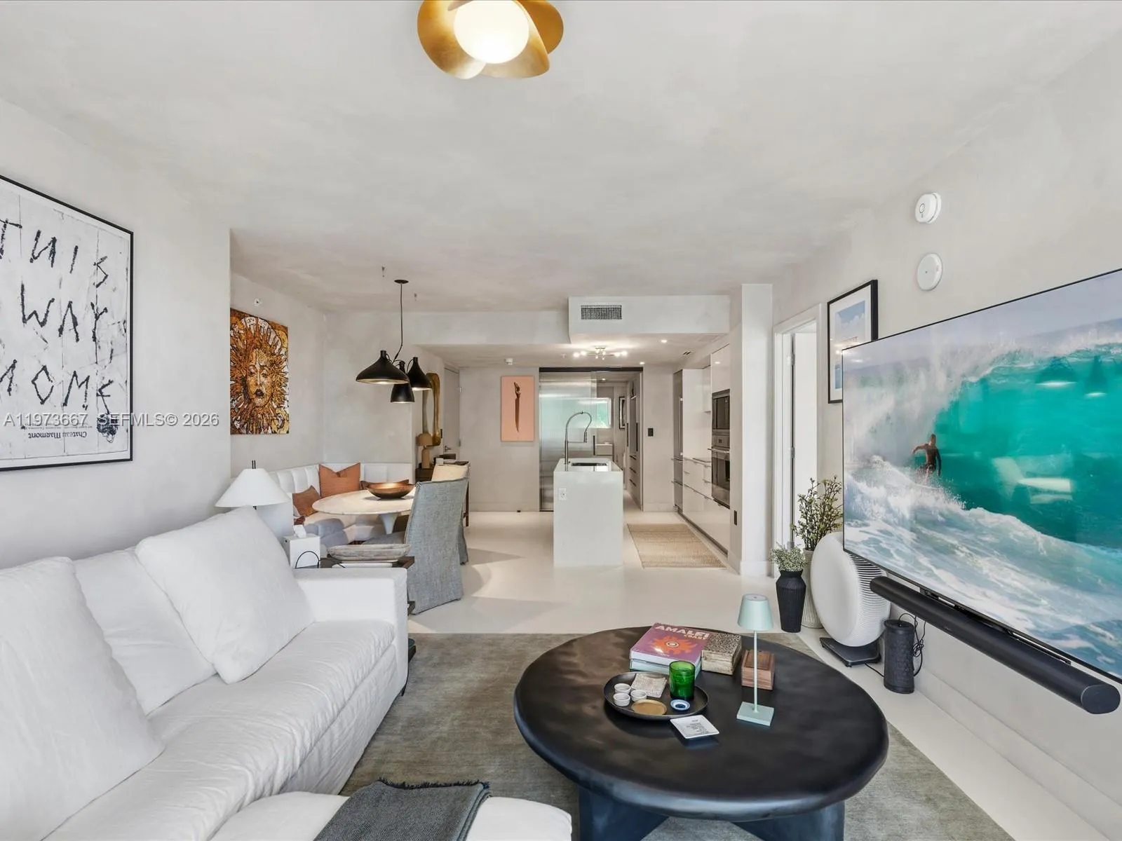 Bijou residence 705 offers a rare opportunity to own a fully customized residence in one of Bay Harbor Islands’ most exclusive boutique waterfront buildings. This modern 1-bedroom plus enclosed den, 2-bathroom home lives like a true 2-bedroom and offers 1,031 interior square feet plus 166 square feet across two private balconies. The spacious primary suite features custom closets and its own private balcony. The enclosed den with custom doors serves as a guest room, office or second bedroom. Designer upgrades elevate every space including polished concrete flooring, custom limewash walls and built-in cabinetry and storage. A custom dining banquette adds style and functionality. Additional highlights include custom shades throughout, a walk-in laundry room and a built-in safe. The Italian-designed MiaCucina kitchen features marble countertops and backsplash paired with premium Wolf and Sub-Zero appliances. Two valet parking spaces are included. Completed in 2021, Bijou is a boutique 9-story waterfront building along Biscayne Bay with 150 feet of Bay Harbor Islands frontage and dock access. Residents enjoy a rooftop lounge with sweeping bay views, fitness center, residents lounge and 24-hour security. The resort-style pool deck features a 36-foot infinity-edge pool overlooking the bay, whirlpool, cabanas, chaises, fire pit lounge and outdoor bar and dining area. Located two blocks from Bal Harbour Shops and moments from beaches, fine dining and luxury shopping.