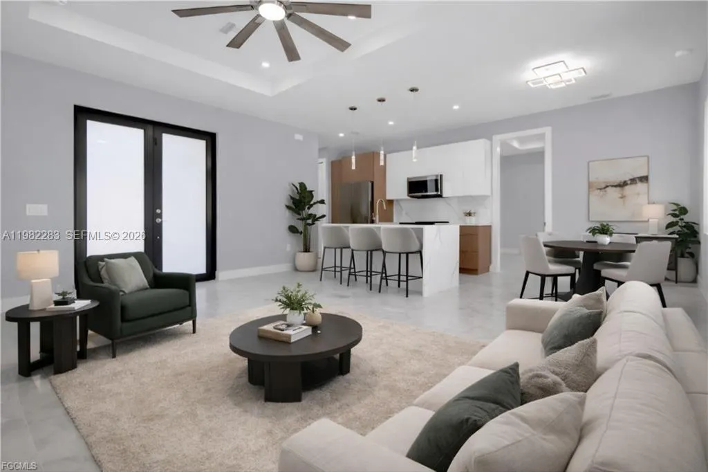 All impact-resistant windows, a 2-car garage with epoxy flooring, and a beautifully designed open-concept layout make this brand-new Lehigh Acres home an exceptional opportunity. Offering nearly 1,200 sq ft of efficiently distributed living space, every area feels bright, functional, and comfortable. High ceilings, recessed lighting, and sleek tile flooring enhance the modern feel throughout. The stylish kitchen features high-quality cabinetry, stainless steel appliances, and a spacious island perfect for entertaining. The primary suite includes a double-sink vanity and elegant finishes for added convenience. Step outside to a covered lanai overlooking a beautiful garden and a generous backyard with room for a pool. Located just minutes from State Road 82 for easy access to Fort Myers and surrounding areas, and situated in a growing residential community, this move-in ready home combines quality construction, smart design, and long-term value—perfect for homeowners or investors alike.