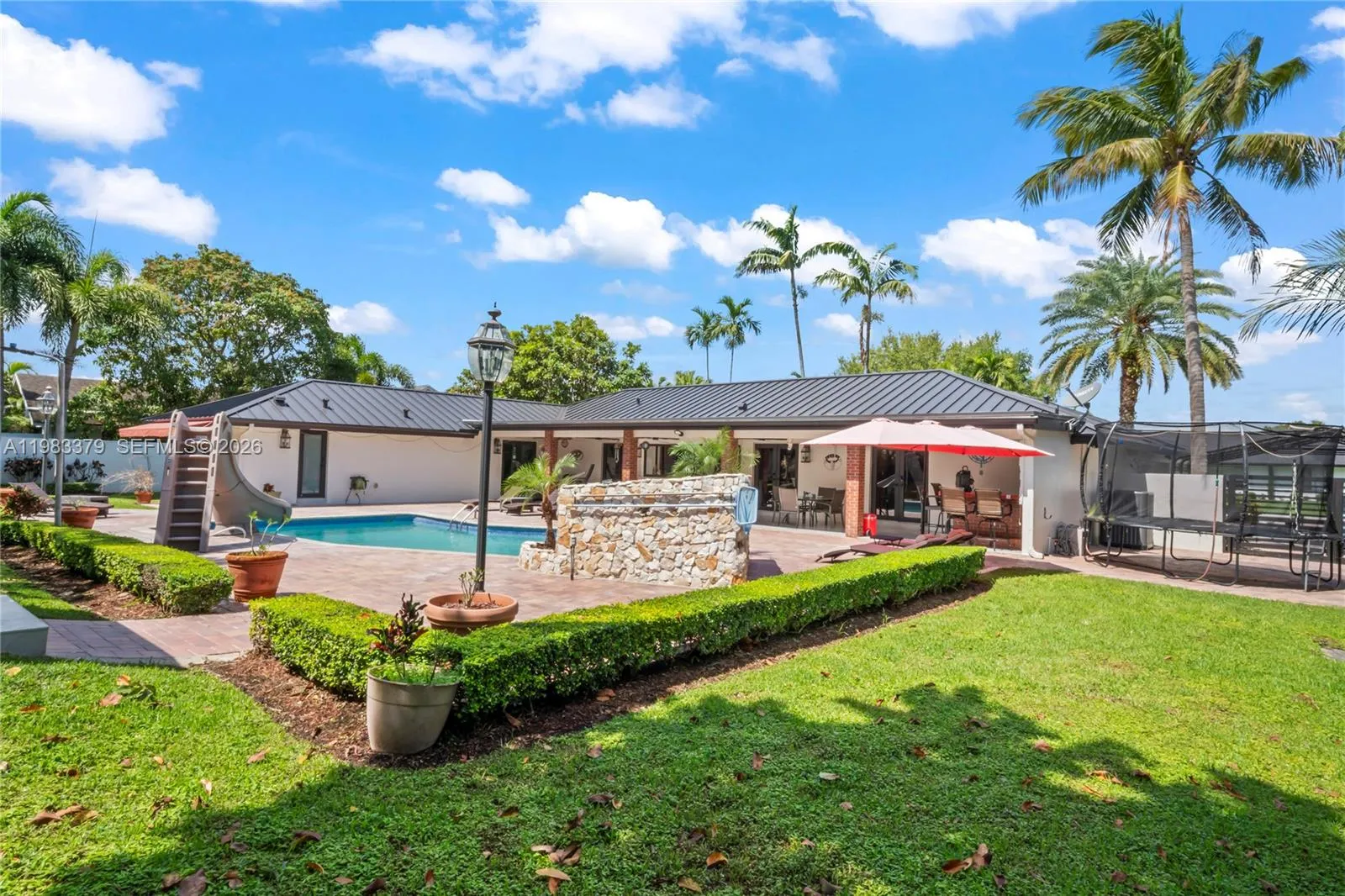 Absolutely stunning home situated on an expansive nearly 20,000 SF lot in desirable unincorporated Miami-Dade. This meticulously maintained property features a new roof, impact windows and doors, and an air conditioner less than one year old.rnrnThe spacious interior offers a beautifully designed kitchen that overlooks the entire backyard, creating the perfect setting for both entertaining and everyday living.rnrnStep outside to your private tropical oasis featuring professionally designed landscaping, elegant lighting throughout the front and backyard, and a full sprinkler system to keep the grounds lush year-round. The backyard includes mature tropical fruit trees such as mango, mamey, and sapote, adding both beauty and the true South Florida lifestyle.rnrnThe property also features attractive pavers in the front and back, a separate pool house, and a cabana bath for convenience. The large swimming pool is approximately 10 feet deep, ideal for accommodating a diving board or trampoline, making it perfect for recreation and entertaining.rnrnLocated near top-rated A-rated schools from elementary through high school, this home also benefits from the lower tax base of unincorporated Miami-Dade.