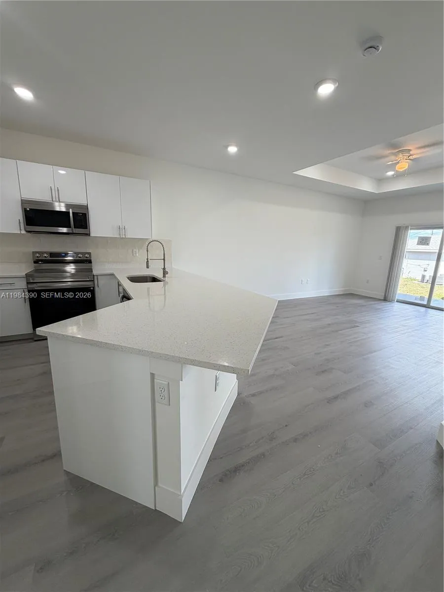 Be the first to live in this stunning brand new 3 bedroom, 2 bath fenced backyard with a divider between both units (Pictures coming soon of updated fenced backyard), providing each residence with its own private outdoor space. Covered lanai, a 1 car garage with additional parking space in the long driveway that can fit two additional cars, designed with modern finishes and comfortable living in mind. This never lived in residence features a bright open concept layout with stylish luxury vinyl flooring, recessed lighting, and large windows that fill the space with natural light.rnrnThe beautiful kitchen is the heart of the home, showcasing sleek quartz countertops, modern cabinetry, stainless steel appliances, and a spacious breakfast bar perfect for casual dining or entertaining guests.rnrnThe spacious bedrooms offer ample closet space, while the bathrooms feature elegant vanities and beautifully tiled walk in showers, creating a clean and contemporary feel throughout the home.rnrnEnjoy the convenience of central A/C, in unit washer and dryer, and a covered lanai with ceiling fan and lighting, ideal for relaxing outdoors. The property also offers generous backyard space for added comfort and privacy.rnrnA perfect combination of modern design, comfort, and brand new construction. Move in ready and waiting for its very first residents.