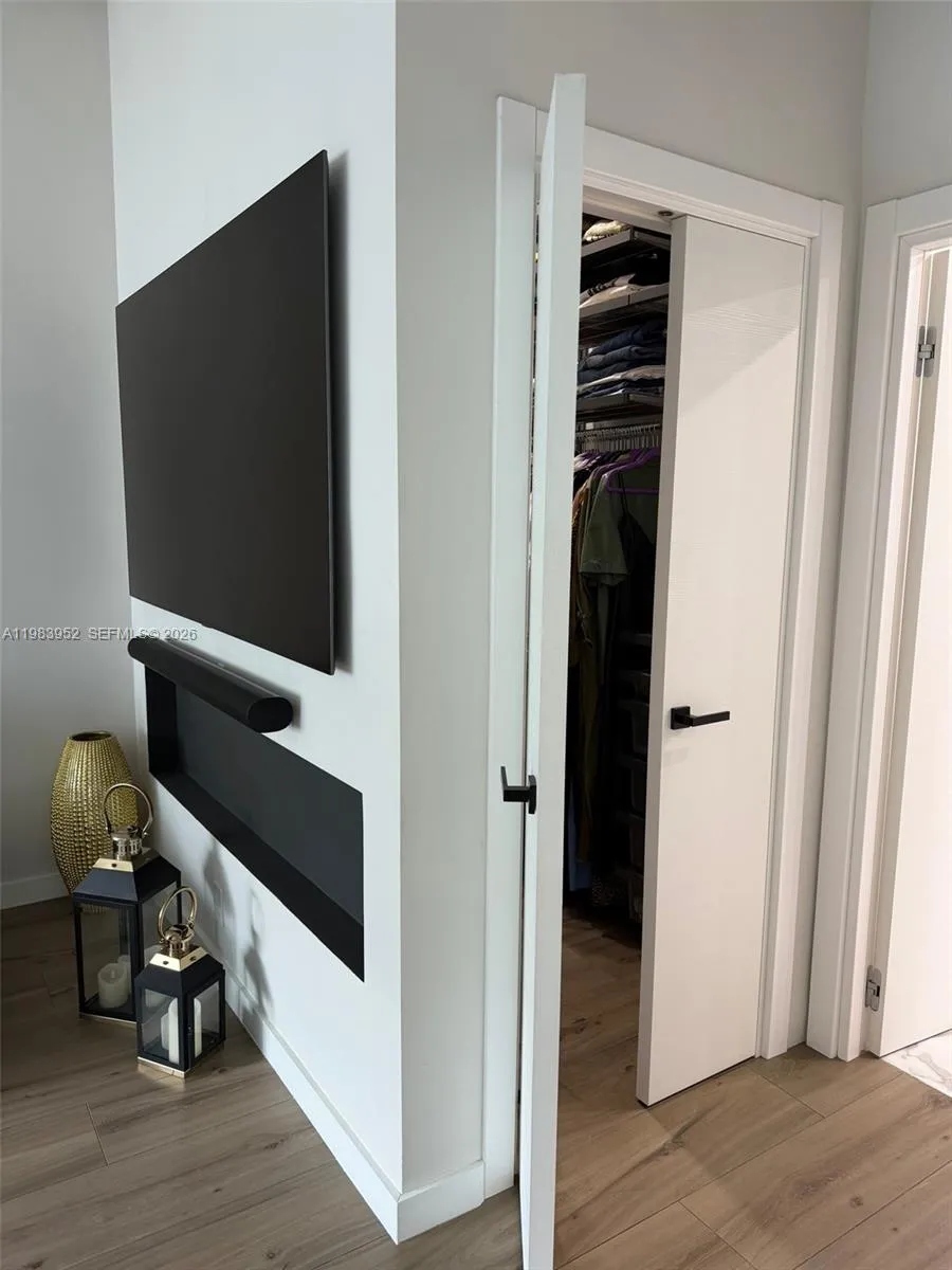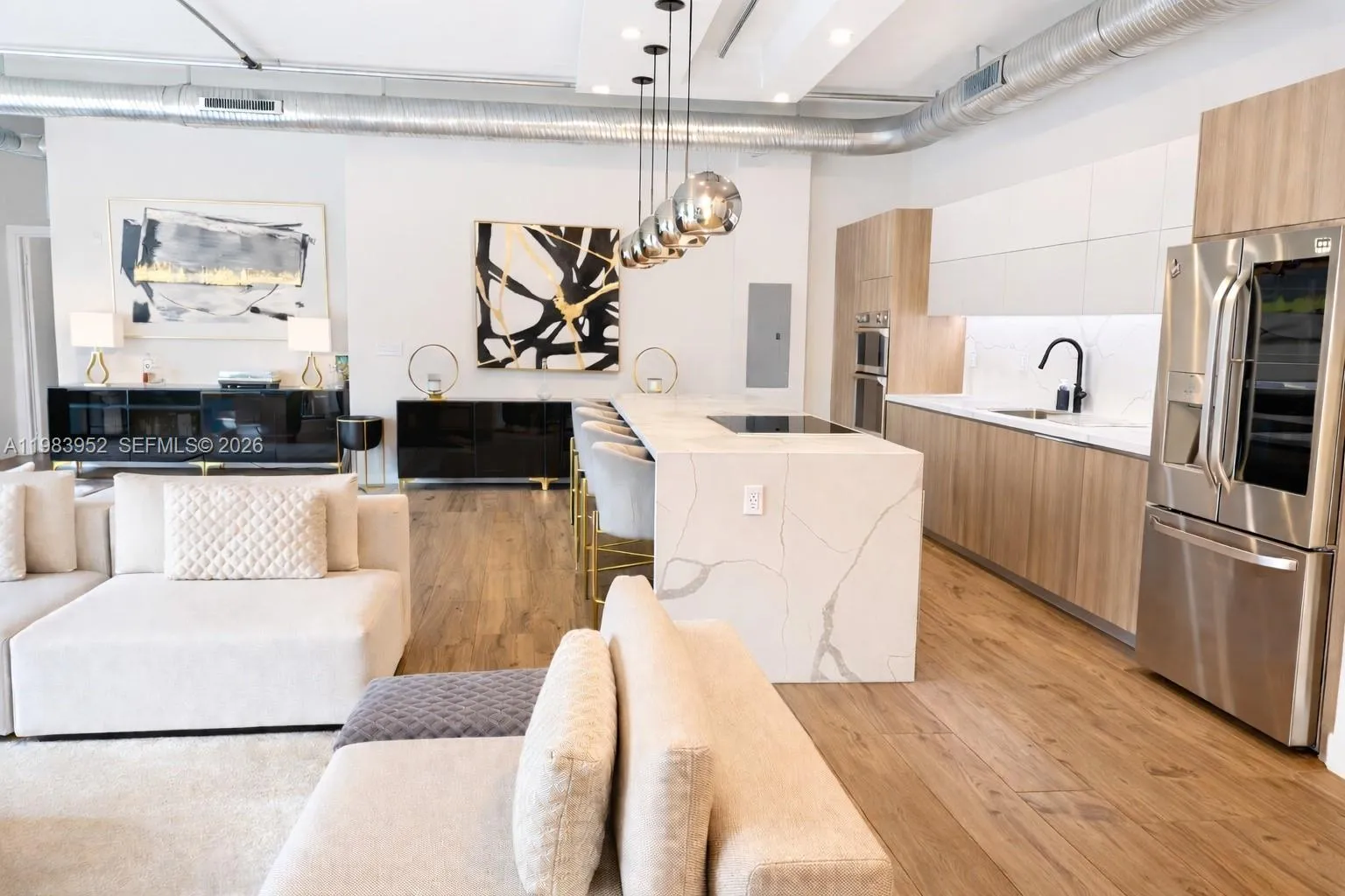 Impeccably renovated loft-style condo in the heart of Hollywood, Florida, blending sophisticated design with open-concept living. Originally configured as a two-bedroom, the interior space has been reimagined into a striking open loft with soaring 11.5-foot ceilings, creating a light-filled interior with dramatic volume.rnThe designer kitchen anchors the living area and features a custom-built oversized island with generous storage, prep space, and seating—ideal for entertaining. Premium appliances include an induction cooktop with a custom downdraft ventilation system, double wall oven, and built-in wine cooler, maintaining clean sightlines while complementing the sleek aesthetic. Renovated bathrooms showcase refined finishes and a spa-inspired feel.rnUpgrades include keypad entry, motorized window blinds, soundproof flooring, and custom solid-core interior doors. Major system updates—new electrical wiring, upgraded electrical panel, and a brand-new water heater—enhance efficiency.rnThe spacious private patio extends the living area outdoors.rnA rare highlight is two covered parking spaces—one deeded plus a grandfathered leased space, a valuable feature within the building.rnIdeally located close to Hollywood’s vibrant dining, shopping and beautiful beaches, this turnkey property offers refined living in a prime South Florida location.