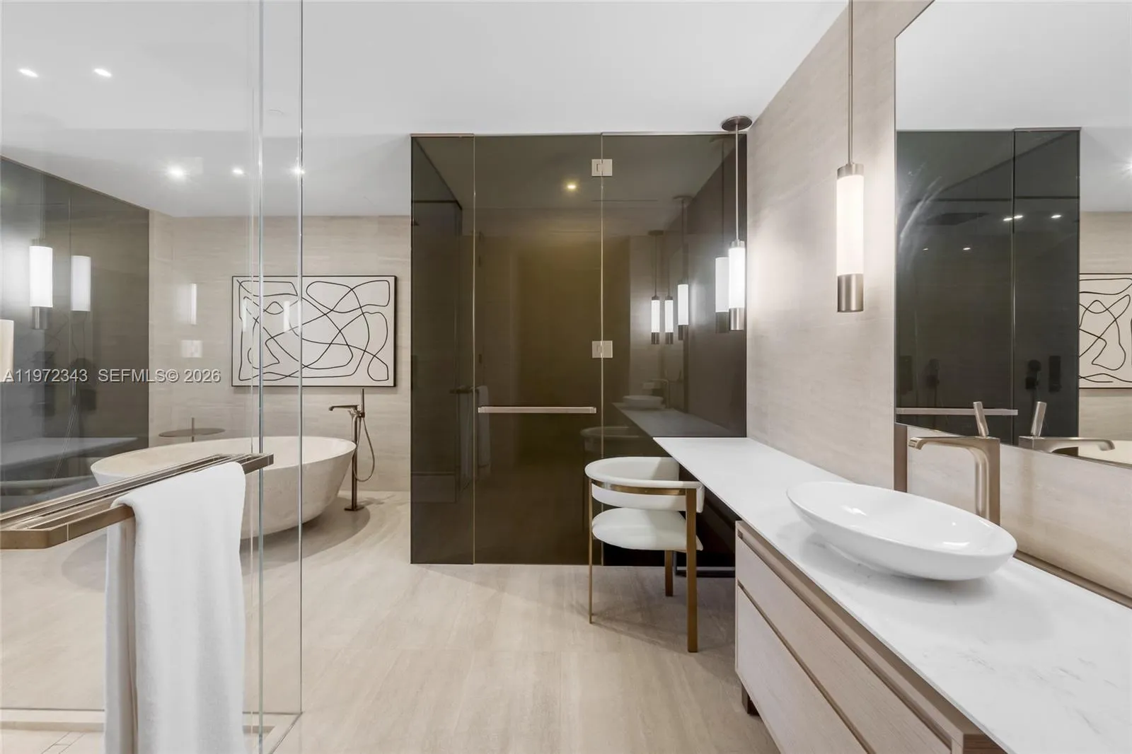 An extraordinary statement in ultra-luxury oceanfront living, this 5,200 SF residence at ARTE Surfside sets a new benchmark for privacy, scale, and architectural integrity. Designed by Antonio Citterio, this four-bedroom, four-and-a-half-bath home features grand proportions, soaring ceilings, and sweeping Atlantic views framed by floor-to-ceiling Schüco impact-rated glass.rnrnCreated for refined living and effortless entertaining, the bespoke Poliform kitchen is equipped with top-tier Gaggenau appliances, including gas cooking, custom cabinetry, and striking marble surfaces. Clean lines and curated finishes define a sophisticated, modern coastal aesthetic.rnrnThe expansive primary suite offers a true retreat with natural stone bath elements, soaking tub, oversized shower, and generous custom closets. Each additional bedroom is privately positioned with en-suite baths.rnrnSeamless indoor-outdoor living flows to a generous oceanfront terrace ideal for hosting or relaxing in total serenity. This ultra-boutique building of just 16 residences is known for exceptional privacy, best-in-class security, and true white-glove service. Amenities include a rooftop tennis court with AC lounge, media room, full kitchen and fridge—arguably the finest private tennis facility anywhere—plus indoor and outdoor lap pools, full wellness spa, state-of-the-art fitness center, private air-conditioned garages, concierge, valet, and 24-hour security.
