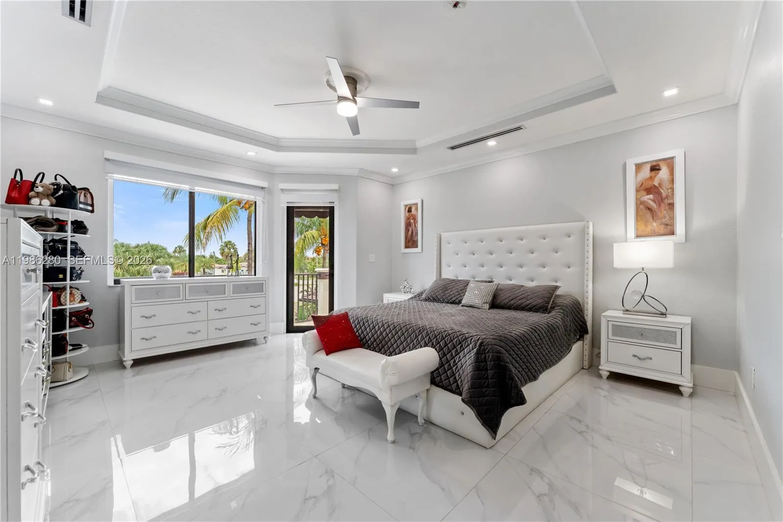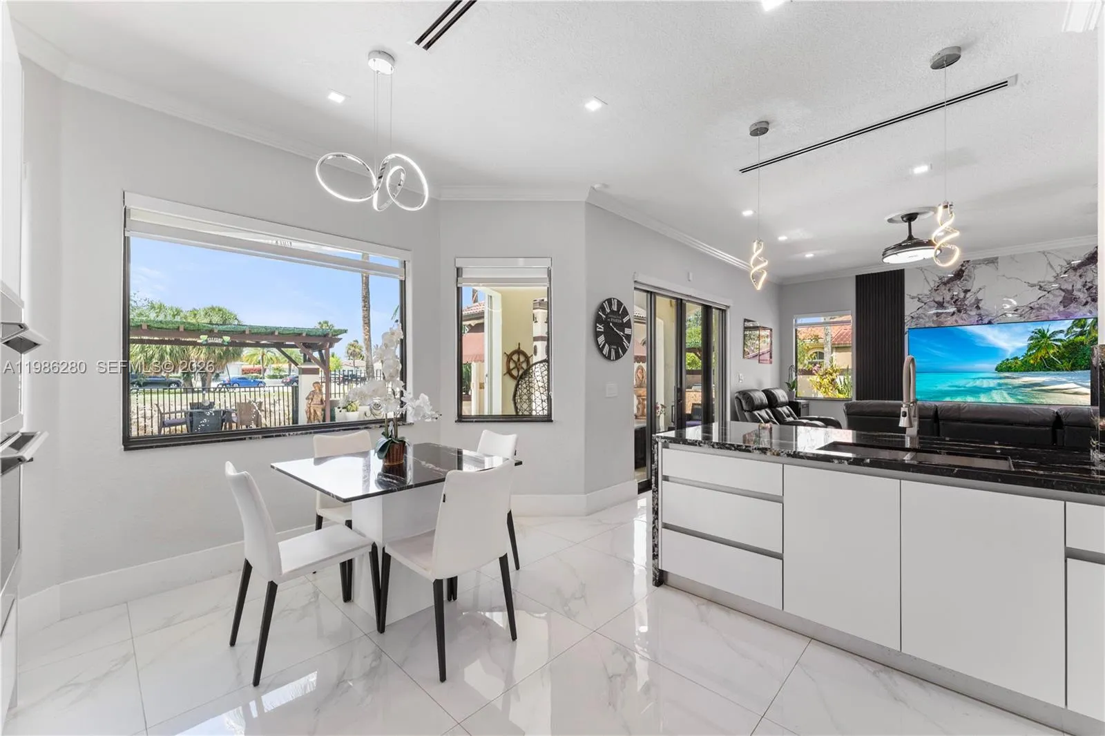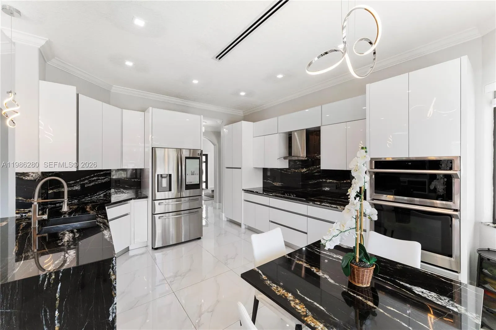 Welcome to 7777 NW 169th Terrace, a true gem located in the highly sought-after gated community of Royal Oaks in Miami Lakes. rnThis impressive two-story single-family residence is one of the first fully fenced homes in the neighborhood, boasting a grandfathered electric triple driveway gates – a rare and valuable safety feature. rnMeticulously remodeled from floor to ceiling and front to back, this 5-bedroom, 3 1/2 bathroom home is move in ready and designed to impress. Enjoy serene canal views, a lushly landscaped front yard, and entertainer’s dream backyard. Step outside to your private resort-style retreat featuring a saltwater heated swimming pool with spa, brand new pool pump, elegant pergolas and a fully loaded concrete gazebo complete with gas range, refrigerator, granite countertops, and custom cabinetry. Entertain effortlessly with a second outdoor grill station, pig roaster, outdoor sinks, surround sound system, two storage sheds and a fully remodeled pool bathroom with walk in shower.rnThe entire driveway, side yard and backyard are mud-set travertine for maximum convenience and aesthetics. rnrnInside, discover refined modern living with 24×24 designer tiles, zebra blinds, impact glass panel staircase, and custom closet cabinetry in every bedroom. The kitchen is a chef’s dream, outfitted with high-end imported Italian acrylic cabinetry and stone, a striking waterfall island, Smart Samsung refrigerator and premium Samsung appliances.