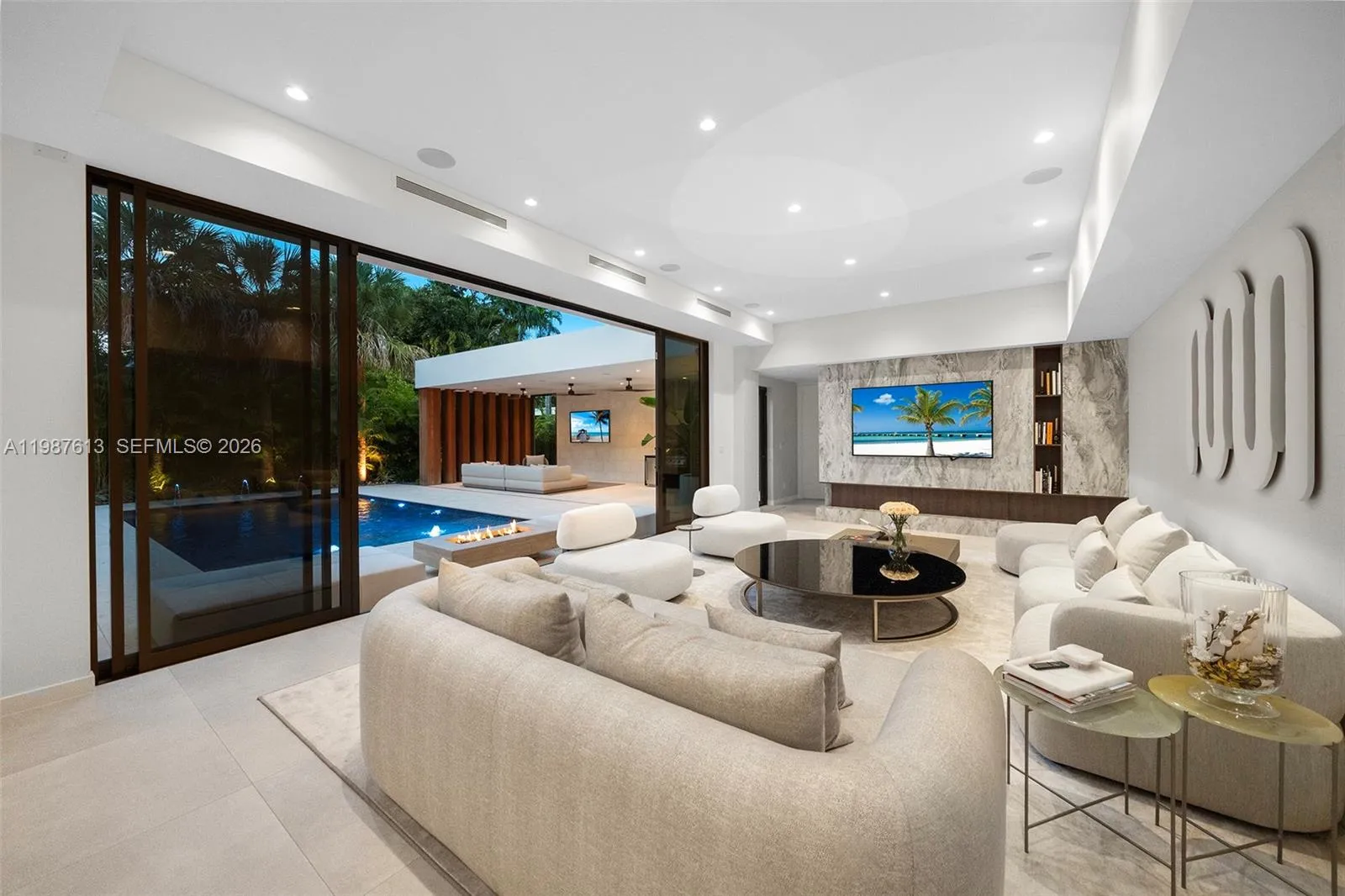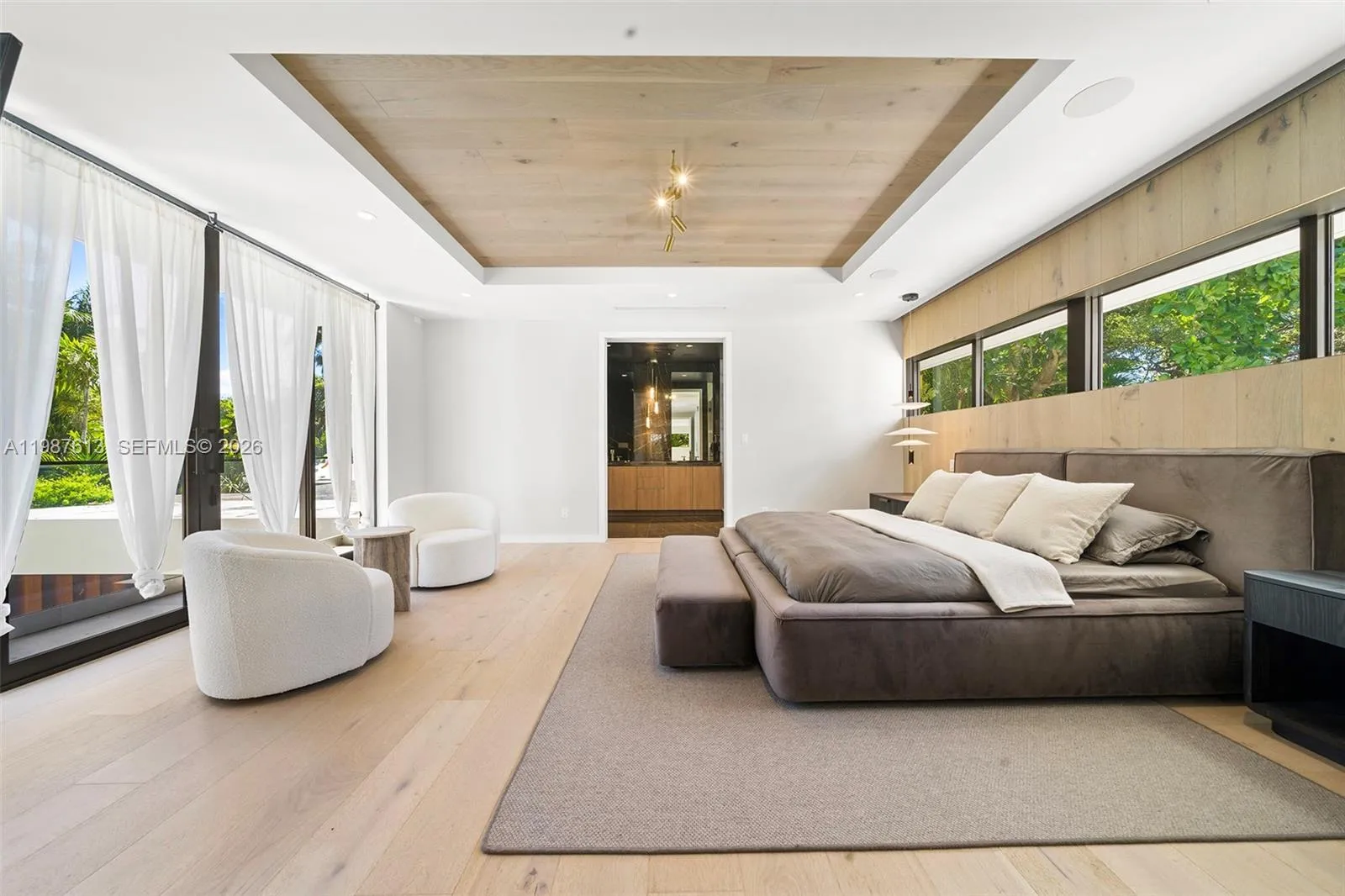 This luxurious 5-bedroom, 6-bath Florida Modern residence boasts over 5,500 square feet of elegantly designed indoor and outdoor living space, nestled among lush tropical landscaping for ultimate privacy and tranquility. Floor-to-ceiling windows bathe the interiors in natural light, highlighting an open-concept layout that effortlessly blends indoor sophistication with outdoor serenity—ideal for entertaining. A dramatic dining area with soaring 22-foot ceilings and a striking floating staircase sets the tone for the home’s impressive design. The impeccably curated Armazem kitchen—with a custom wine cellar—flows into a spacious great room that opens to a covered poolside terrace featuring a fully equipped outdoor kitchen with an icemaker.