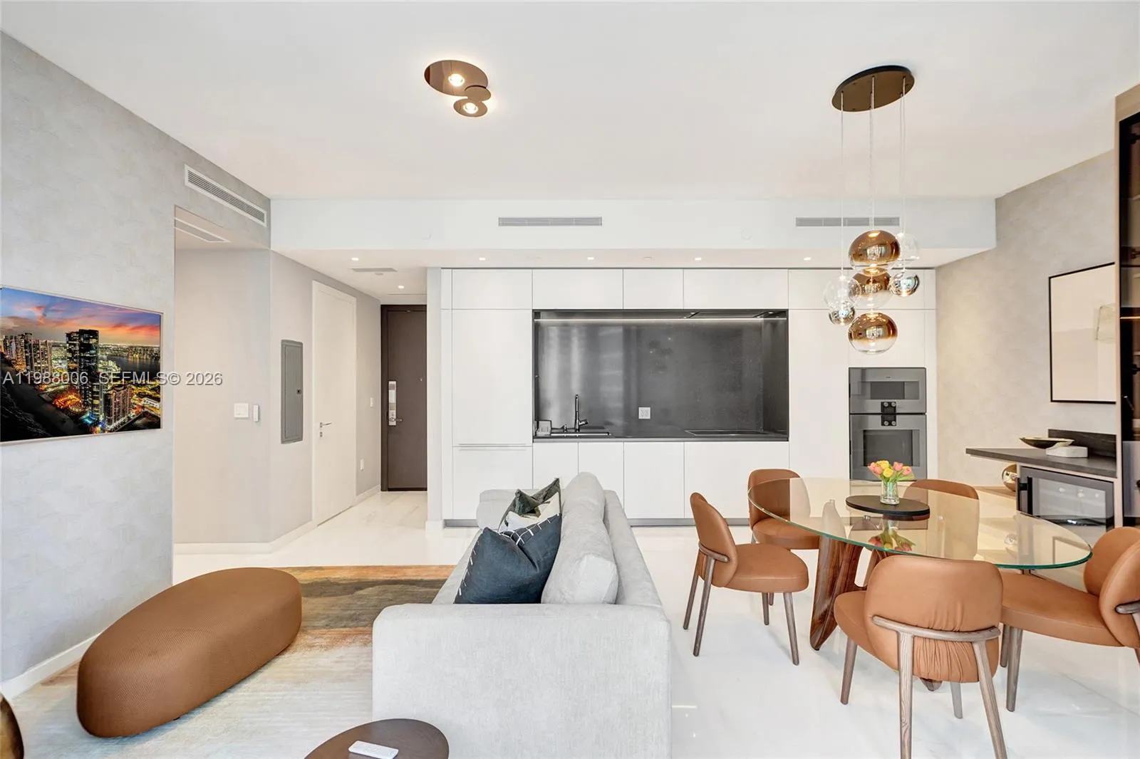 A refined, designer-furnished residence at Aston Martin Residences. Residence 1808 is offered fully turnkey, with a curated interior that emphasizes clean lines, quality materials, and a calm, modern aesthetic.rnFloor-to-ceiling glass frames open city and pool views, bringing natural light into the living spaces. The kitchen is appointed with Gaggenau appliances, Bulthaup cabinetry, and integrated lighting, seamlessly connected to the main living area.rnThoughtfully equipped with electric roll-down shades, dimmable lights and custom furnishings throughout, the residence is designed for immediate, effortless living.rnResidents enjoy access to over 42,000 sq ft of Sky Amenities, including a rooftop infinity-edge pool, spa, fitness center, lounges, and full-service concierge.rnPositioned in a prime waterfront setting, moments from Brickell, dining, and cultural destinations.rnAvailable for immediate occupancy. Click on the Virtual tour for a video.