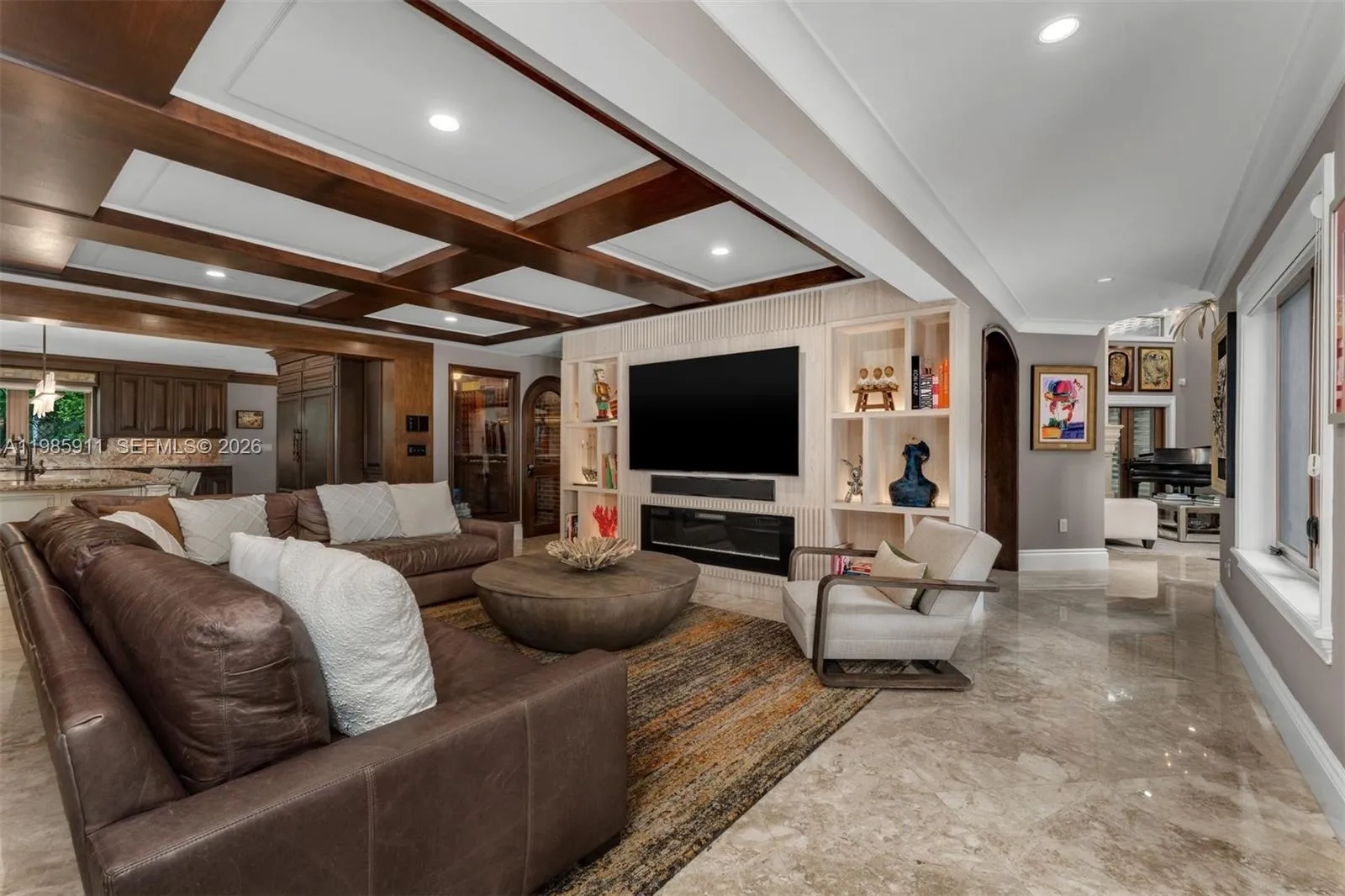 Set on a sprawling 1.12-acre lot in the heart of Pinecrest, this extraordinary grand Tuscan-inspired estate offers 6,624 SF under air and 9,771 total SF with 6 bedrooms and 8.5 bathrooms. A gated entry and sweeping oak-lined driveway lead to a private, resort-style compound defined by timeless Mediterranean architecture, a barrel tile roof, and lush, manicured grounds. The multi-structure layout surrounds a spectacular heated saltwater pool and spa, with covered terraces and a fully equipped summer kitchen for seamless indoor-outdoor living. Interiors feature soaring ceilings, travertine, wood and stone floors, a dramatic atrium courtyard, formal living and dining rooms, and a spacious family room. The chef’s kitchen is equipped with granite countertops, custom cabinetry, Sub-Zero refrigeration, and a full Thermador appliance suite. Additional highlights include a custom bar, wine cellar, home theater, and private office. The main-level primary suite offers a sitting area and a spa-inspired bath with soaking tub, dual vanities, and walk-in closets. A separate guest residence with living area and kitchenette, plus staff quarters, provide flexibility. Modern comforts include impact windows, Control4 smart home and audio, Generac generator, mosquito system, 3-car garage, and more—delivering exceptional privacy and comfort in one of Pinecrest’s most desirable settings.