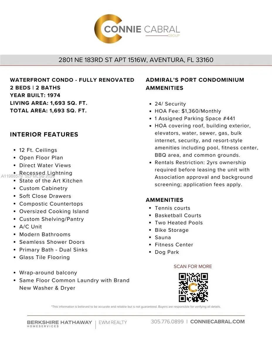 Welcome to Aventura, Florida! This rare direct waterfront corner unit offers 2 spacious bedrooms & 2 full baths with direct bay views , spectacular sunset and Intracoastal views. The open-concept layout is fully renovated to maximize water views from every angle, including the expansive wraparound terrace—perfect for dining or relaxing. The modern kitchen features an oversized island, floor-to-ceiling cabinetry, full pantry & extra storage. Enjoy resort-style amenities including two heated pools, tennis courts, gym and a well appointed outdoor summer kitchen alloeing for the perfect barbecue. Convenient same-floor laundry. Located minutes from Aventura Mall, world-class dining, and pristine beaches, this unit delivers luxury and location. Bus service to Aaventura Mall. Don’t miss this opportunity to live in a renovated waterfront condo in Aventura’s prime location! 24 hour notice for showing is a must!