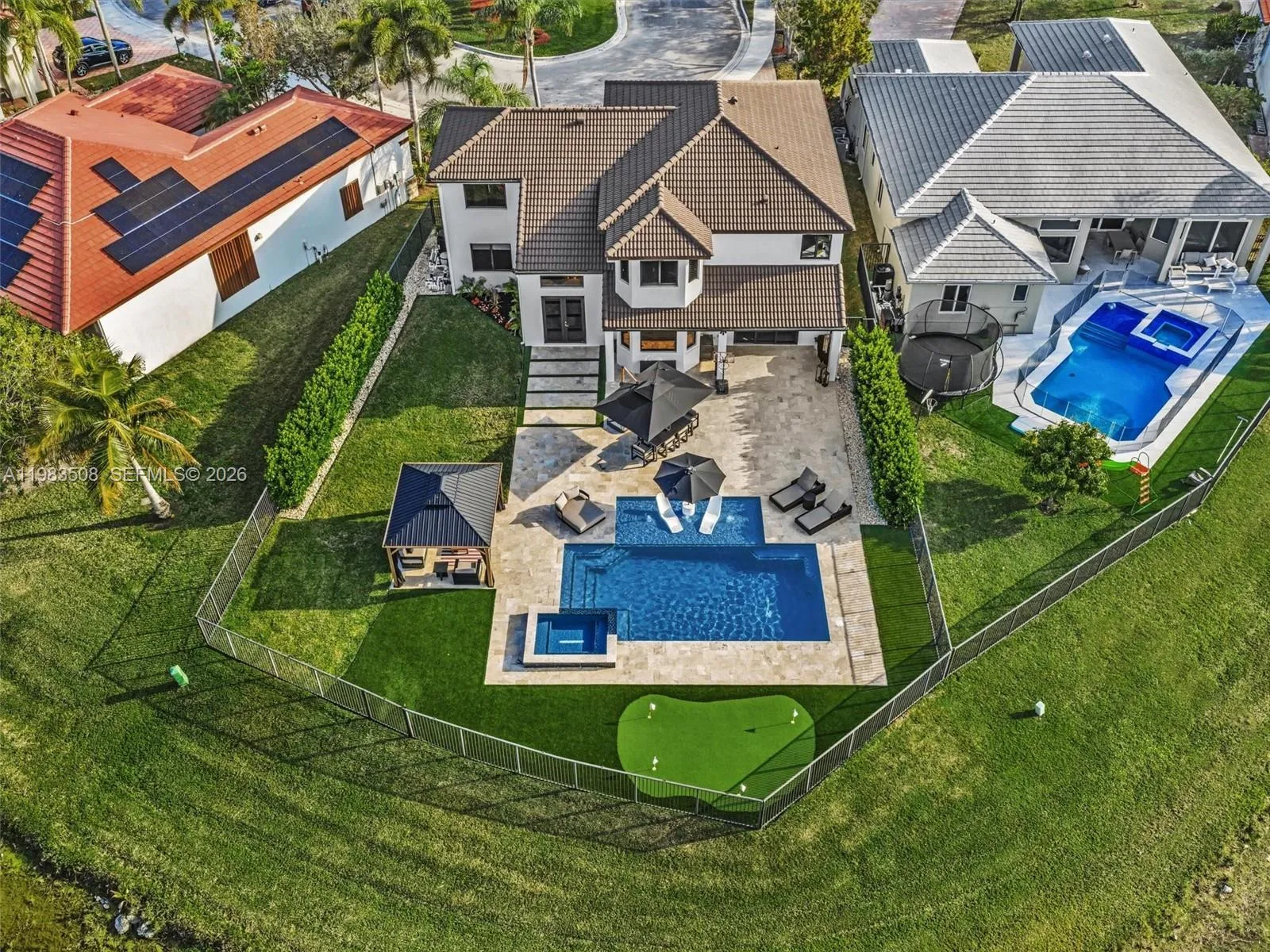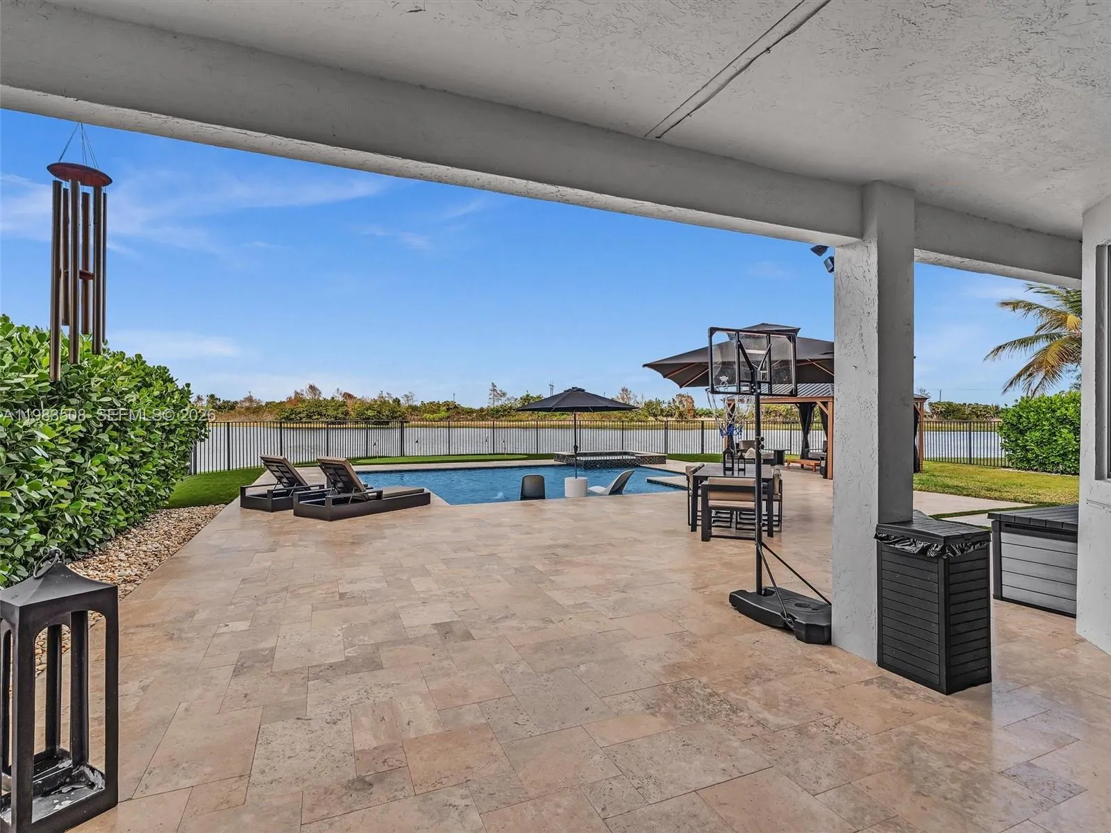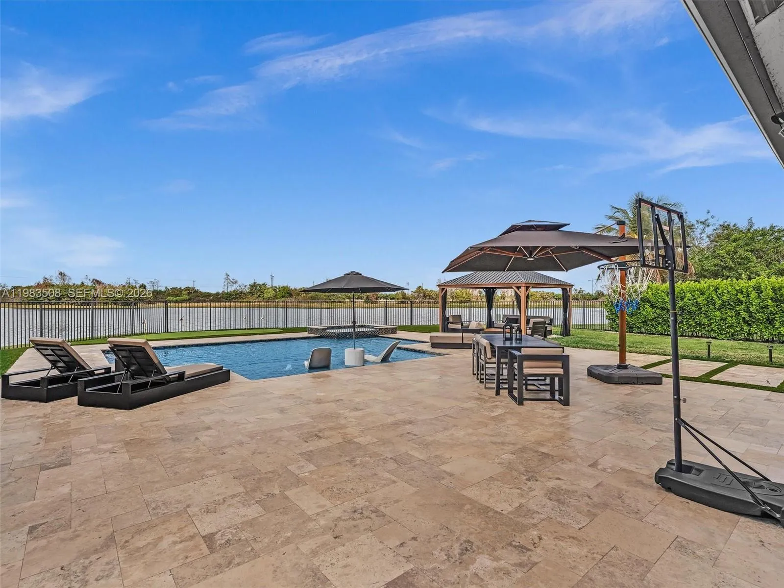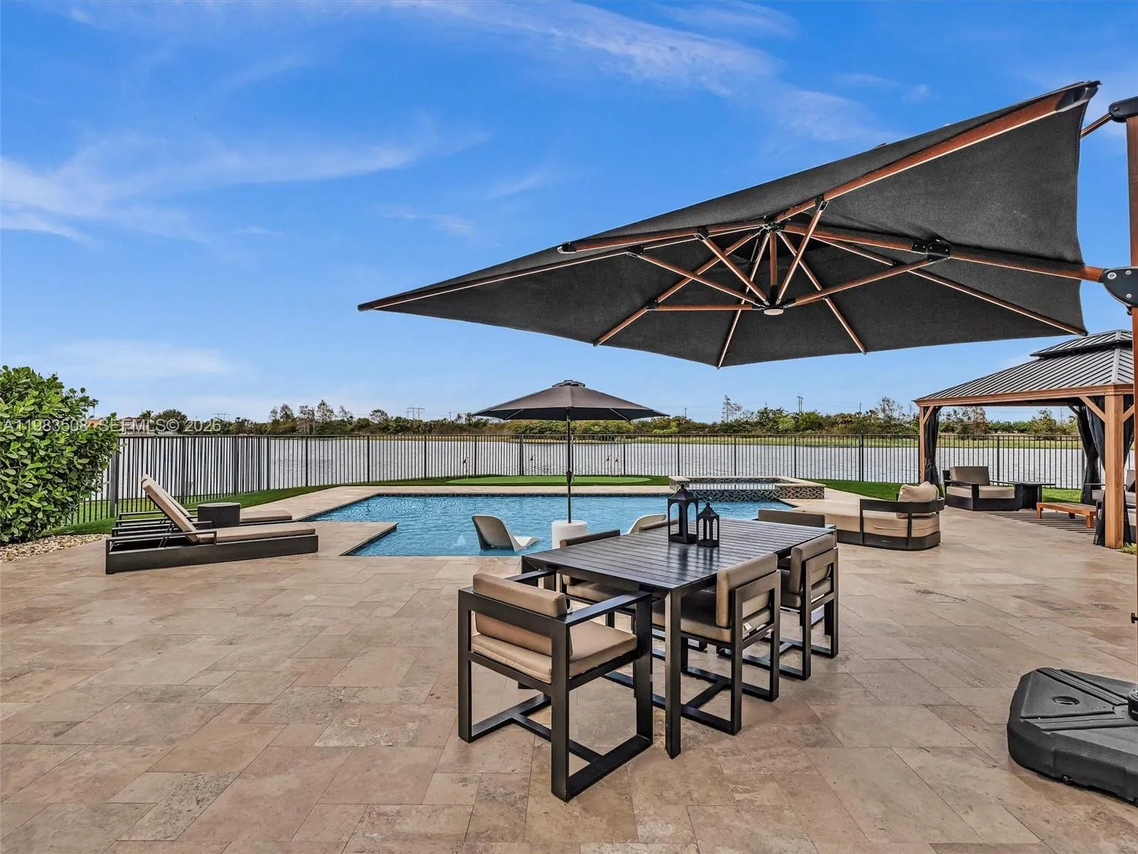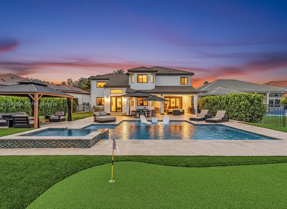 Fully renovated waterfront residence nestled on a quiet cul-de-sac in the gated community of North Lakes. Offering 3,031 SF of living space on the largest lot currently available in the neighborhood, a rare 13,000± SF waterfront lot with privacy and unobstructed lake views, ideally positioned for abundant natural light and beautiful sunsets all year long. A dramatic 10FT impact front door opens to stunning sightlines through the home to the pool and lake. The interior showcases Italian porcelain flooring, solid oak stairs and wall panels, designer finishes, and full impact windows & doors throughout. The chef’s kitchen features top-tier appliances, quartzite countertops, a quartz island, solid brass fixtures with pot filler, handmade Zellige tile backsplash, and an LED-lit bar. The primary suite on the 2nd level offers a spacious sitting area with serene lake views. The outdoor living experience is nothing short of extraordinary. Designed as a private waterfront sanctuary, the heated saltwater pool and spa feature a spacious sun shelf with in-water loungers, LED lighting, and elegant water features. The expansive patio provides multiple lounge areas complemented by a gazebo and a private mini golf putting green, offering complete privacy and uninterrupted water views rarely found. A rare opportunity to own the largest waterfront lot available in North Lakes, combining modern design, privacy, and elevated outdoor living.
