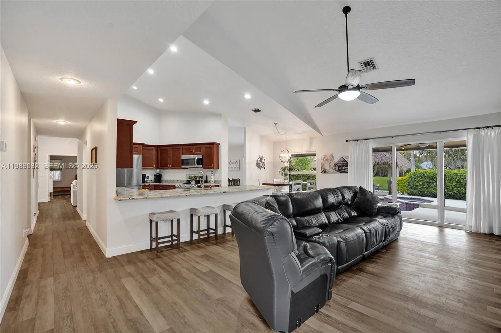 Welcome home to this Beautiful 4BR/3BA waterfront, pool home featuring a spacious 3-way split bedroom layout and full hurricane impact glass & doors throughout for safety and peace of mind. Sleek laminate flooring in all rooms.rnrnThe primary suite has tray ceilings and sliding doors to the backyard, creating a bright, open retreat. The primary bath features double sinks, a sunken tub, and a separate shower. Bathrooms are upgraded with marble flooring, granite counters, and glass-enclosed showers.rnrnEnjoy stunning water views from nearly every room, overlooking the canal and heated pool area—perfect for true indoor-outdoor living.rnrnThis well-designed home offers vaulted ceilings, a formal living/dining area & a large family room that opens to an updated kitchen with granite countertops, wood cabinetry, stainless steel appliances and eat-in breakfast area.rnrnStep outside to your private oasis featuring a heated pool with a jacuzzi, and a newly added tiki hut retreat overlooking the water with a small dock for boating—ideal for relaxing or entertaining.rnrnAdditional highlights include a 2-car garage, separate laundry room, backyard storage shed, sprinkler system, huge yard.rnrnLocated in one of Cooper City’s most desirable neighborhoods with A-rated schools and NO HOA. Just minutes to major highways, shopping, dining, Hospital and approximately 15 minutes to Fort Lauderdale Airport, Hollywood Beach & Broadwalk, and only 5 minutes to the Hard Rock Resort Hotel & Casino