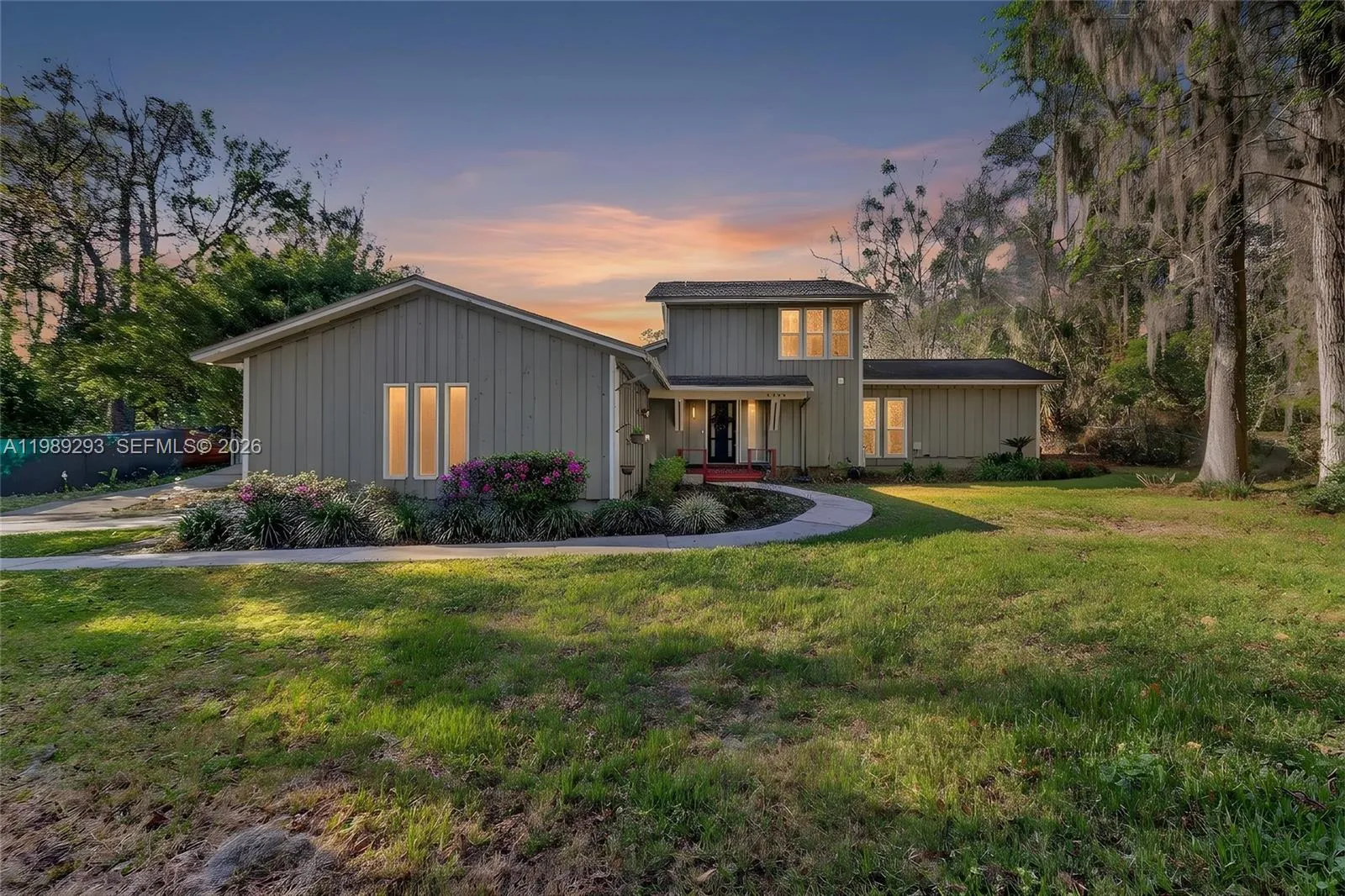 Tucked away on a private 3/4-acre lot in desirable Buckingham East neighborhood, this 1970’s mid-century inspired ranch home offers a rare blend of light filled living and serene natural surroundings. Walls of glass and an open layout create seamless indoor-outdoor flow designed for everyday comfort and effortless entertaining. Located minutes from shopping, dining and all of Gainesville’s amenities—including theaters, hospitals and the University of Florida—this property offers both accessibility and tranquility. Set deep within the lot, the home is surrounded by lush trees in the front yard, ensuring privacy and remarkable curb appeal, while also serving as a sanctuary for local birdlife. The surrounding gardens create an enchanting oasis, showcasing a rich tapestry of flower gardens, tropical foliage, woodlands, bamboo, manicured lawns and fluttering butterflies. Abundant natural light fills the space, highlighting a kitchen with maple cabinetry, granite countertops and S/S appliances. The kitchen seamlessly connects to the dining and living areas, which boast nearly full-height windows that frame views of the decks, gardens, and surrounding landscape. The master suite located on the main floor for added convenience opens to a private patio. The upstairs bedrooms offer beautiful views and share a full bathroom. Well-lit outdoor living spaces for entertaining while also providing a tranquil setting for evening meditation. The 720 sf Workshop is a unique and rare feature.