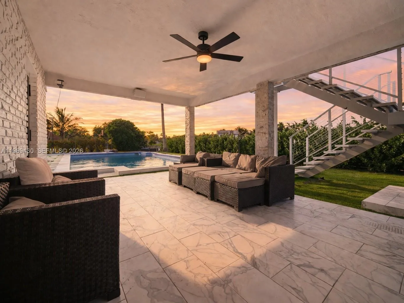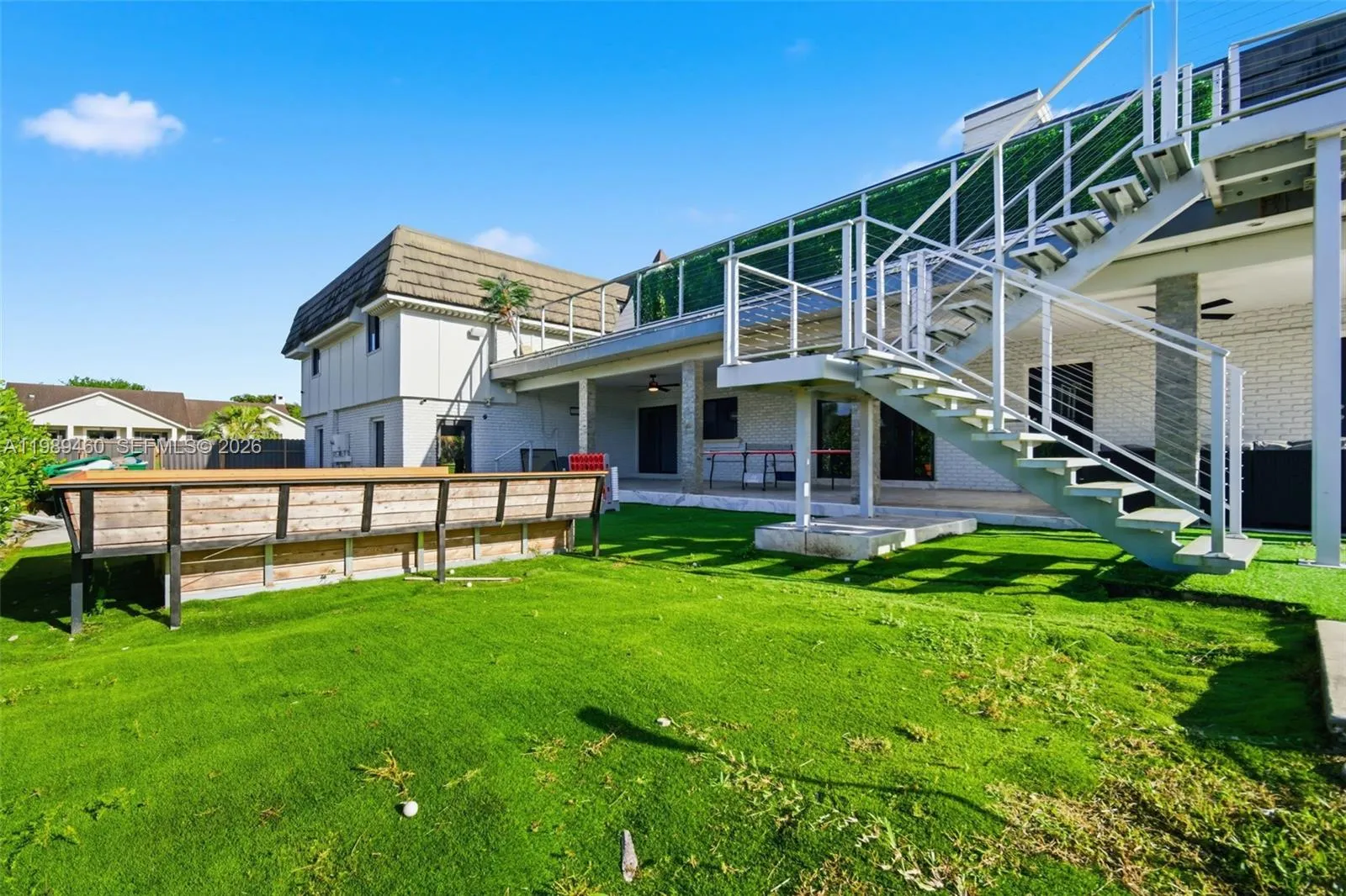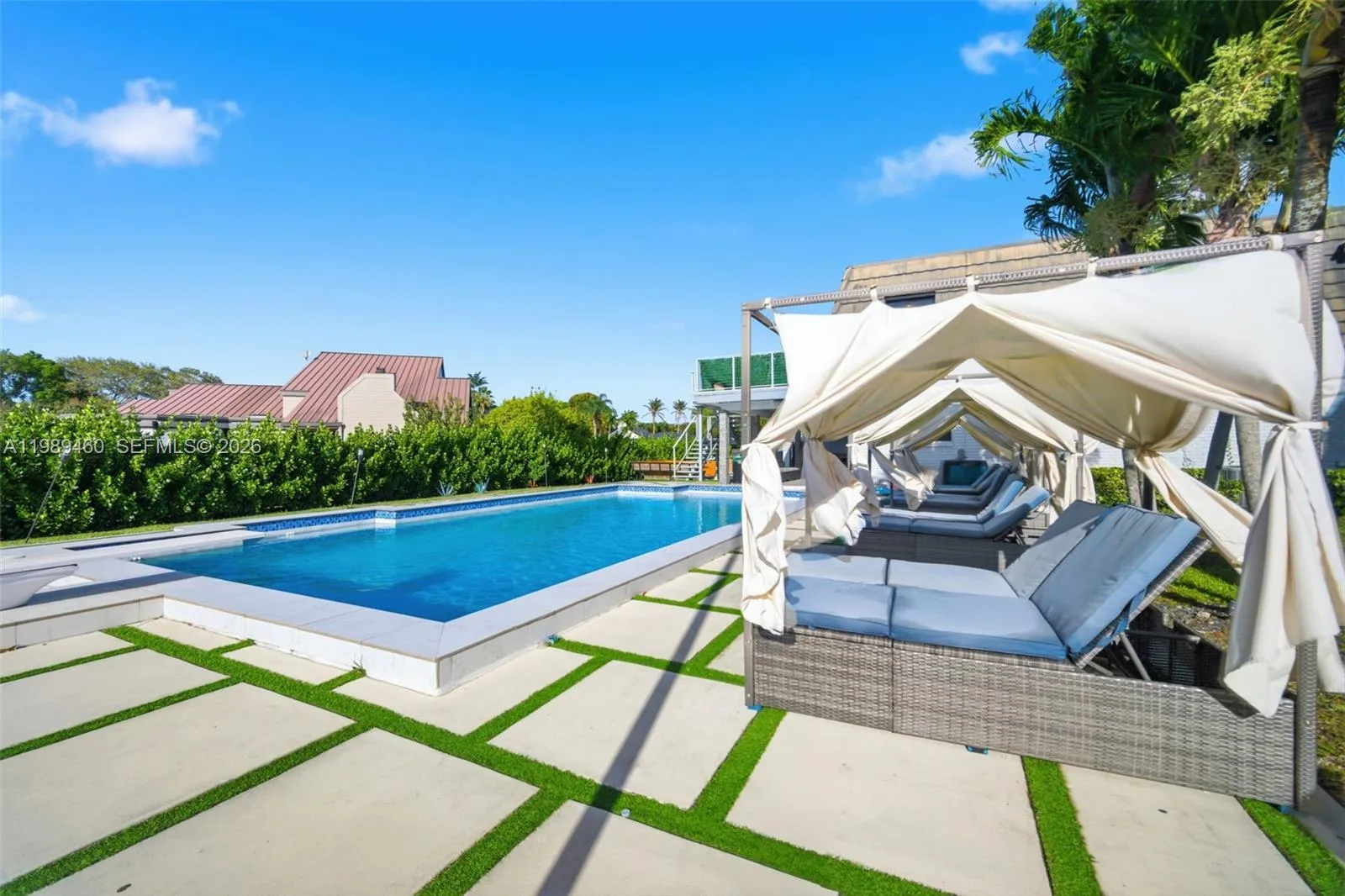 Discover a truly unique Cape Cod–style residence with striking contemporary flair, ideally nestled on a quiet cul-de-sac in the heart of Davie. Completely renovated with a focus on modern luxury and everyday comfort, this exceptional home showcases open-concept living spaces, soaring ceilings, and sleek, high-end finishes throughout.rnDesigned for both entertaining and relaxed living, the home features a chef’s kitchen, a sophisticated glass-enclosed bar, and a dedicated theater room. The spacious primary suite offers a private retreat with a dry bar, a large walk-in closet, and a beautifully appointed bath. A home elevator adds an extra layer of convenience and accessibility.rnStep outside to an expansive resort-style setting where a sparkling pool overlooks tranquil lake views. Enjoy your own private tennis court—also lined for basketball—a charming gazebo seating area, and generous open space perfect for gatherings. With a private dock, you can kayak, paddleboard, or water cycle right from your backyard.rnSet in one of Broward County’s most desirable communities, Davie is known for its unique blend of western charm and modern living, excellent schools, and proximity to parks, shopping, and dining—all just a short drive from Miami. Offering three garage spaces and thoughtfully designed for a luxury lifestyle, this one-of-a-kind property is even more impressive in person.