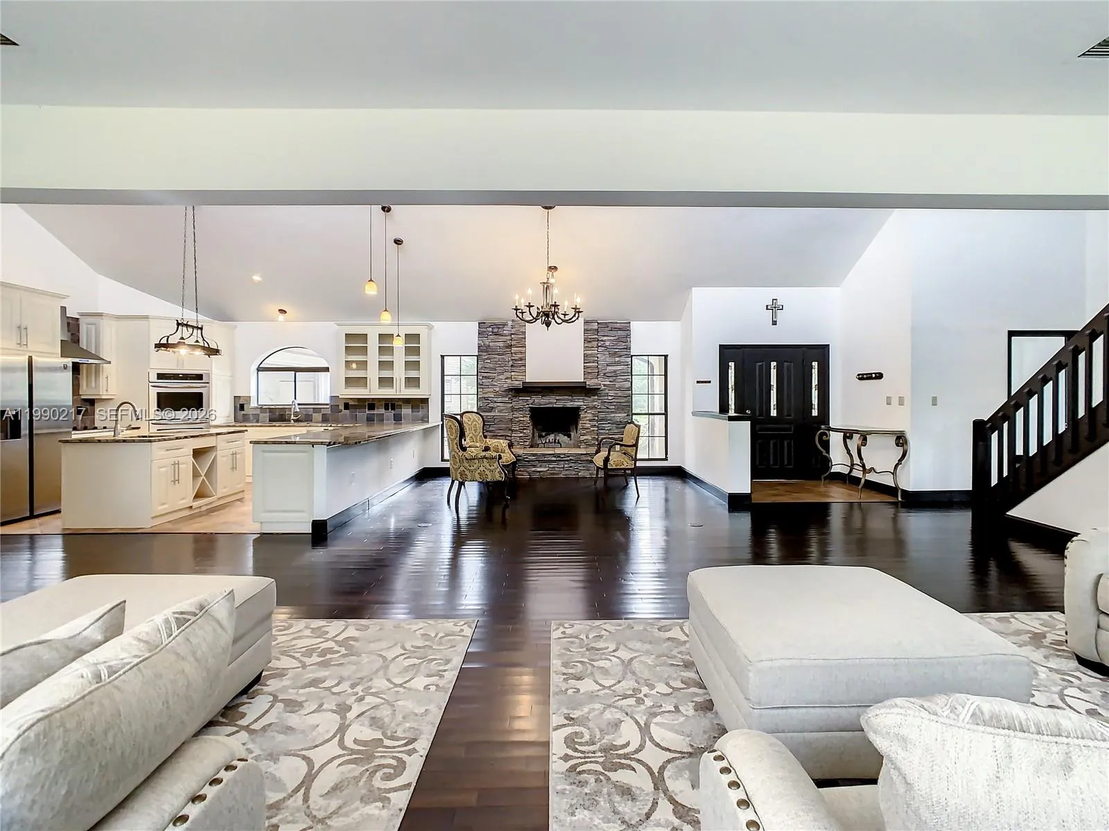 4-bedroom, 2.5-bath home in the gated community of Hidden Harbor. This amazing property features a large kitchen with stainless steel appliances and granite countertops, a wood-burning fireplace in the living room, and a covered patio with a pond—perfect for cool Florida evenings. The master suite is on one side of the home for privacy, two bedrooms are on the opposite side, and a fourth bedroom with a loft is located upstairs. The property sits on one acre of land.