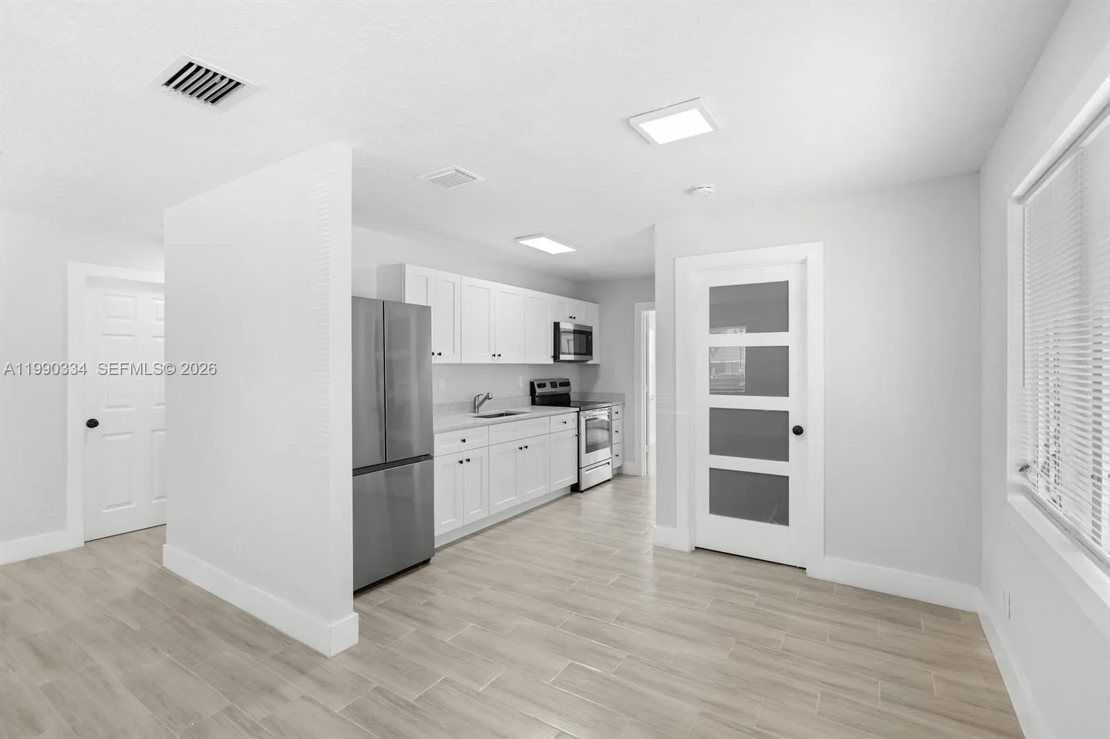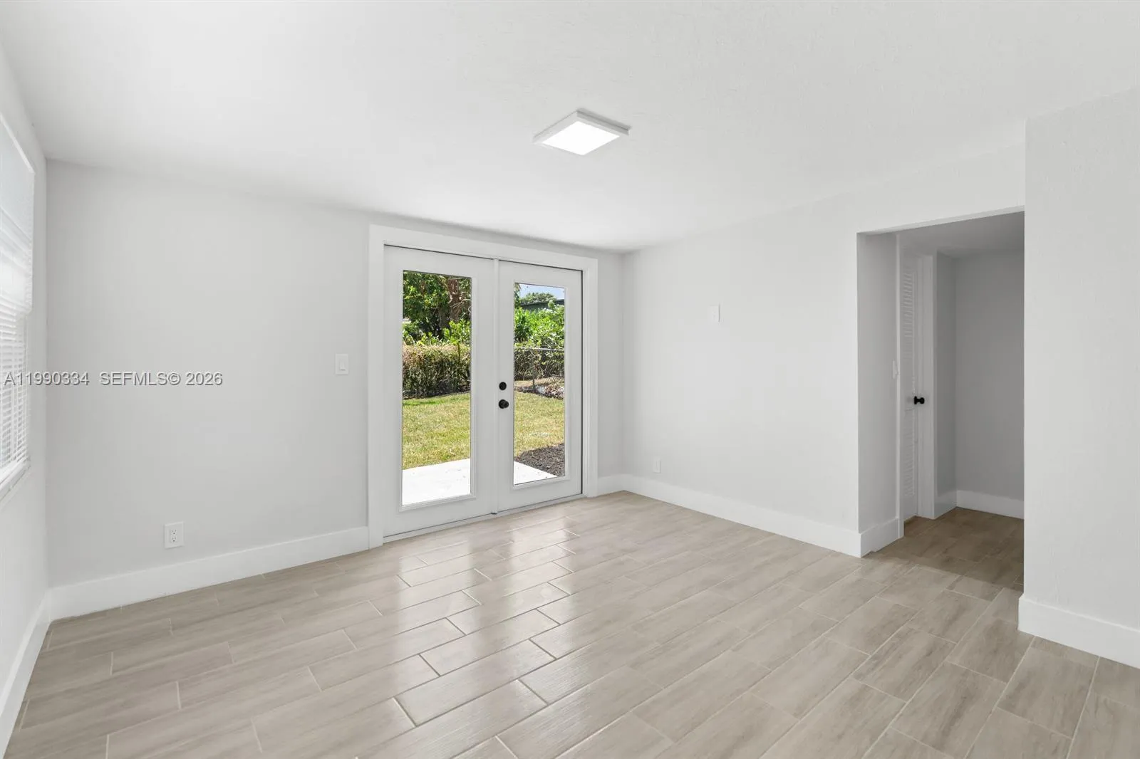 Welcome home! This charming property greets you with a cozy front porch and an expansive, fully fenced backyard perfectly sized for entertaining, pets, or even your future pool. Inside, you’ll find a thoughtfully designed split floor plan. Two secondary bedrooms and a shared bath are situated on one side, while the primary suite is privately tucked away behind the kitchen for added comfort and seclusion.rnrnEnjoy modern living with no carpet throughout—just sleek, plank-style tile flooring that flows seamlessly from room to room. Both bathrooms are updated, and the spacious primary suite features a walk-in closet and French doors that open directly to the backyard. This home also offers the convenience of an indoor laundry room and a beautifully updated kitchen complete with white shaker cabinets, quartz countertops, new appliances, and an undermount stainless steel sink—perfect for everyday living and entertaining alike.