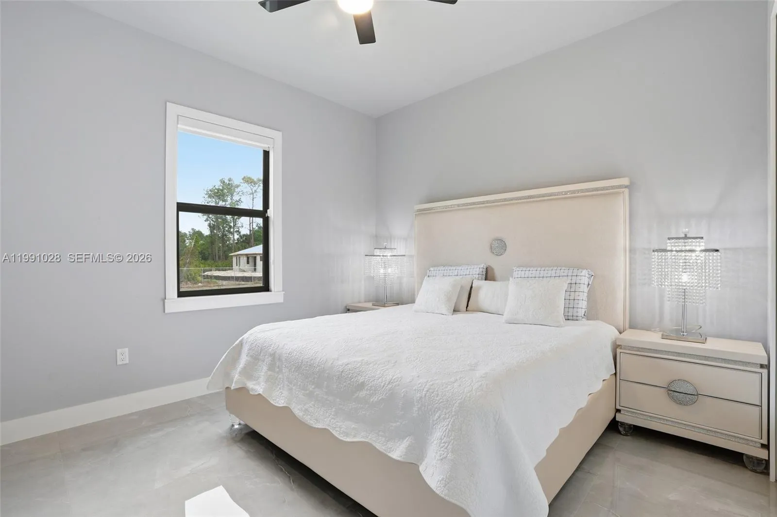 Golden Gate Estates home on 2.75 acres featuring a split-bedroom layout, a spacious kitchen with ivory soft-close cabinets and beautiful countertops, plus a office room. Enjoy high ceilings and recessed lighting throughout. The property offers a large covered patio, garage, and a fully fenced lot with a private entrance. The grounds have been prepared for parking—perfect for an RV, boat, or semi-truck. Impact windows throughout for added security and efficiency.